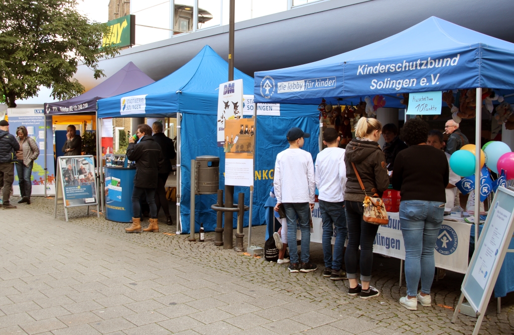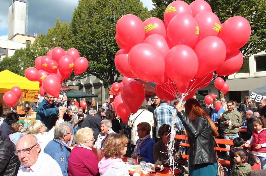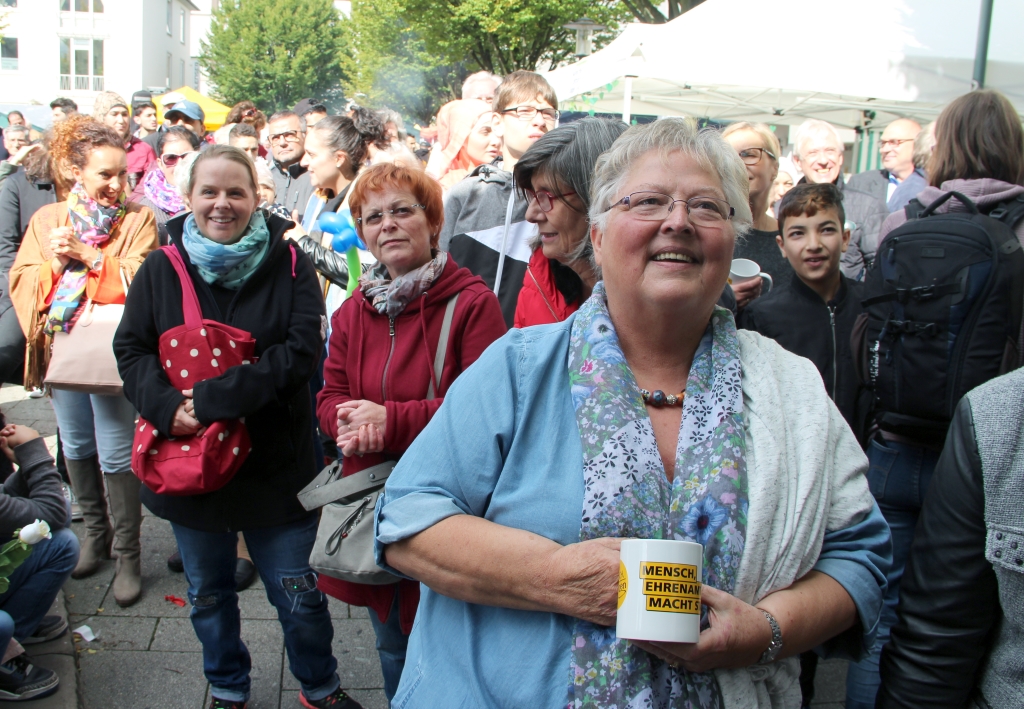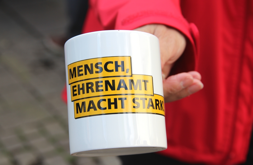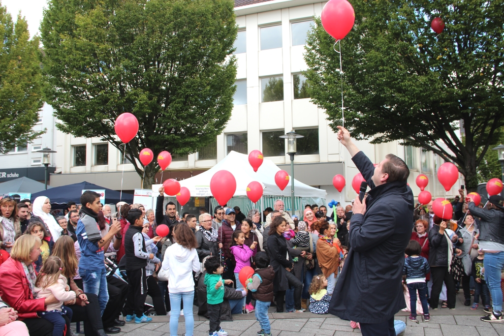 Am frühen Nachmittag wurden zunächst unzählige Luftballons in den zu diesem Zeitpunkt noch weitestgehend blauen Himmel entlassen. Allesamt waren sie mit dem Schriftzug „Mensch, Ehrenamt macht stark“ versehen. Dieser war auch auf den Tassen zu lesen, die von den Veranstaltern verteilt wurden. Im Rahmen der deutschlandweiten Aktion „Engagement macht stark“ wurden auch in Solingen Patenschaften für Flüchtlinge mit Bundesmitteln unterstützt.