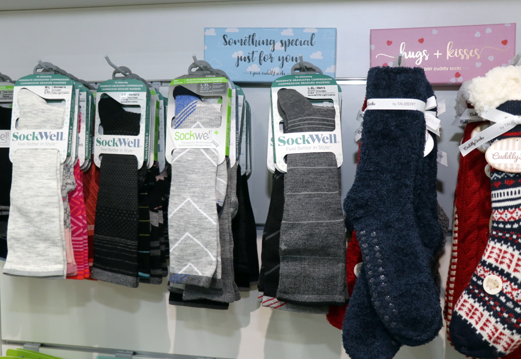 „Auch Produkte für eine Lichttherapie, für Menschen, die leicht depressiv sind und etwas für die Seele tun wollen“, so Gatawetzki-Köppchen. Wer derweil etwas für die eigenen oder die Füße seiner Liebsten tun will, der darf sich über eine große Auswahl der Firma Sockwell freuen. „Die Socken dieser Firma wurden noch einmal nachgearbeitet und sind nun noch angenehmer zu tragen. Die gehen hier auch weg wie geschnitten Brot“, schmunzelt Miriam Gatawetzki-Köppchen.