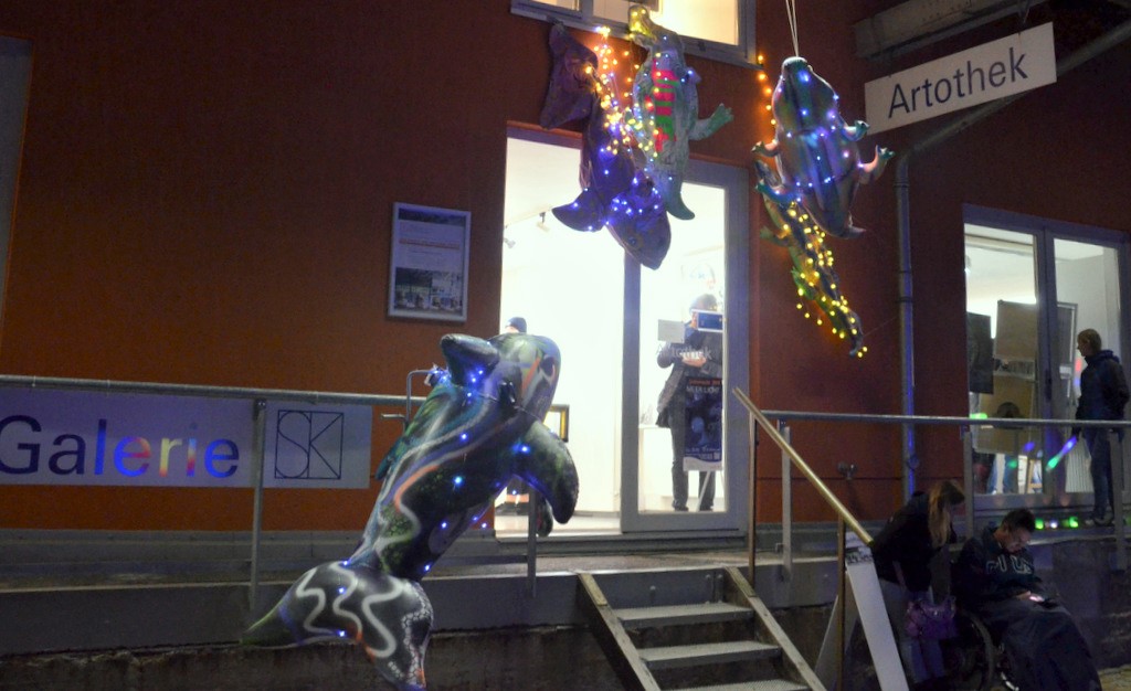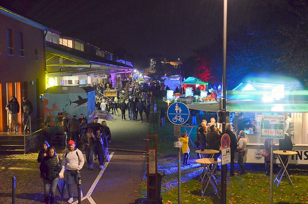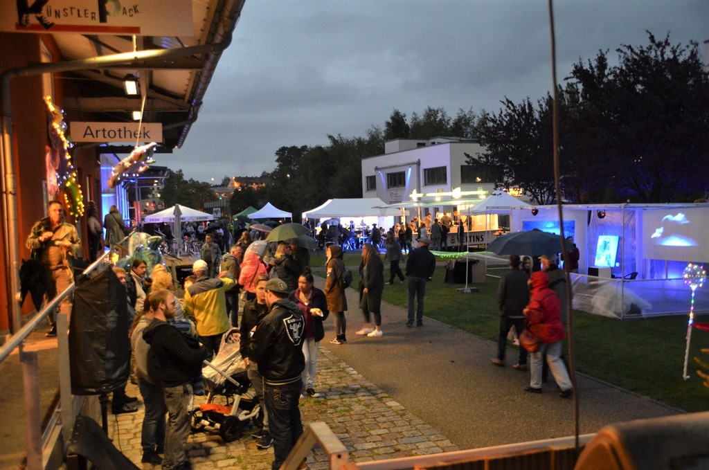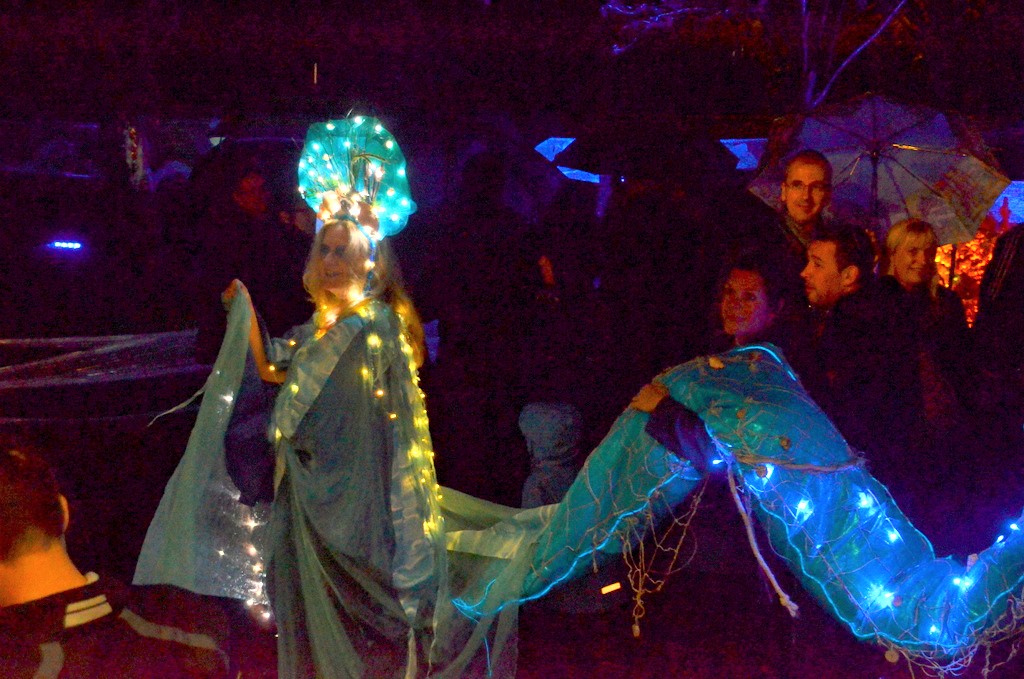 „Es ist wieder einmal eine tolle Lichternacht“, freute sich Eventmanagerin Petra Krötzsch. „Es ist zwar durch den Regen nicht so voll, wie wir es uns gewünscht hätten, aber die Stimmung ist fantastisch.“ Sie selbst hatte an diesem Abend ihre Wette eingelöst und wandelte als Meerjungfrau, von einem Seepferdchen begleitet, vor den Ateliers entlang. Aufsehenerregend war nicht zuletzt der fünf Meter lange Meerjungfernschwanz, der von Designerin Anke Kauermann getragen wurde, die das Kostüm entworfen und genäht hatte.