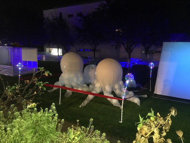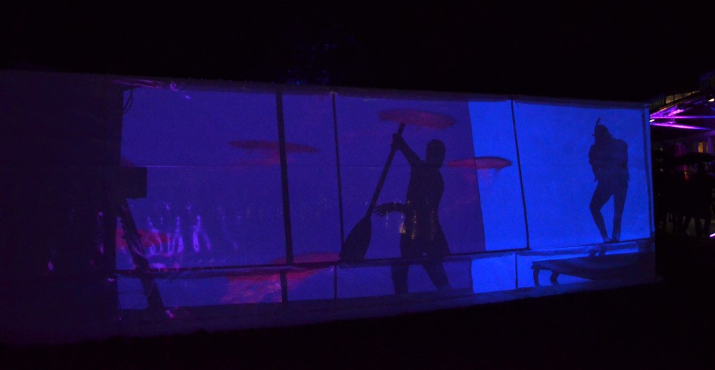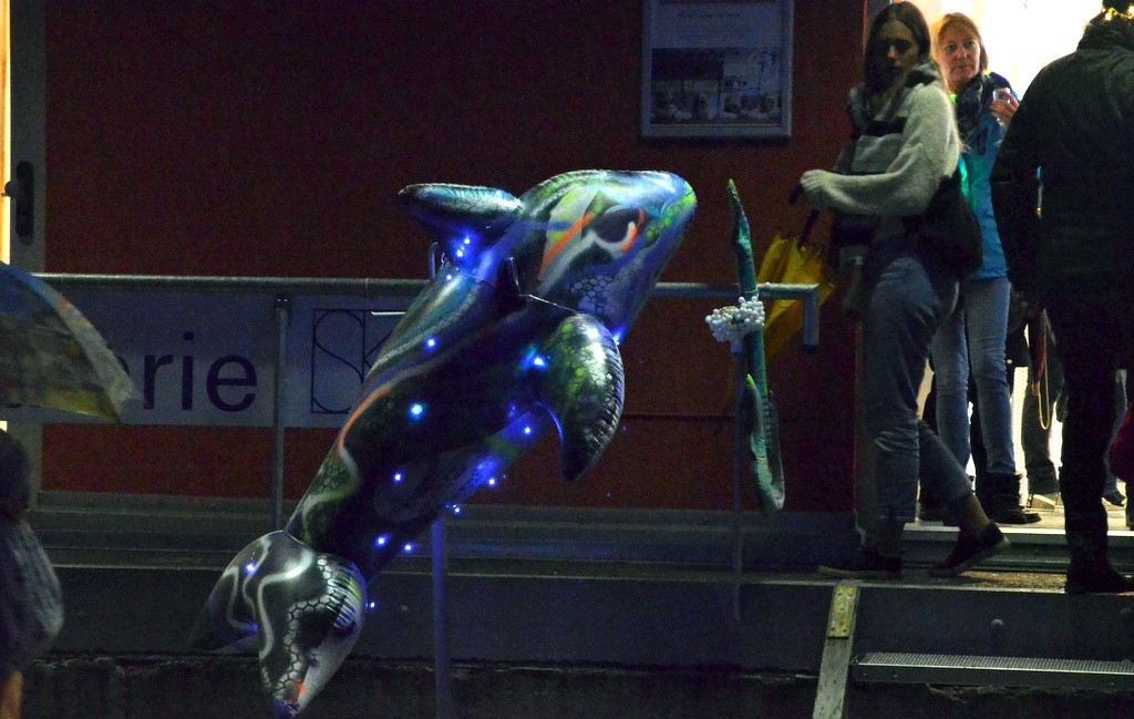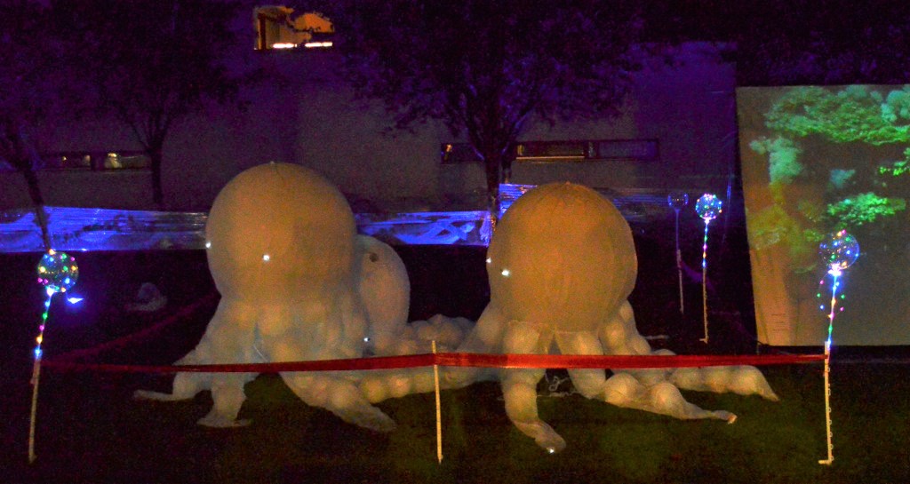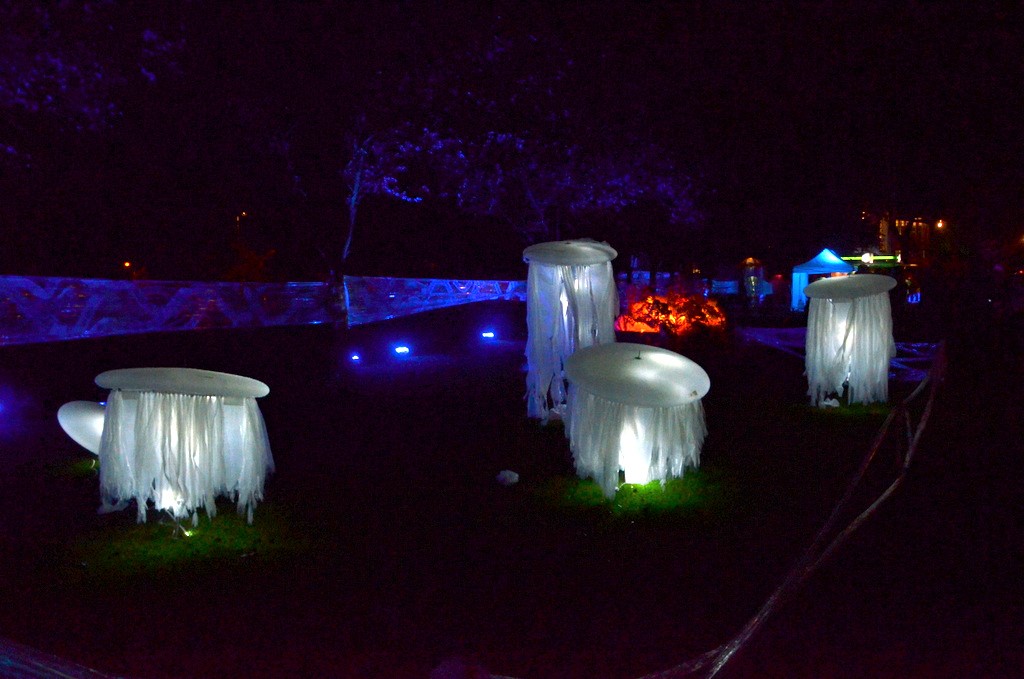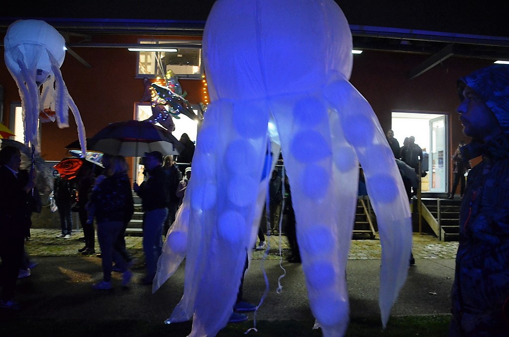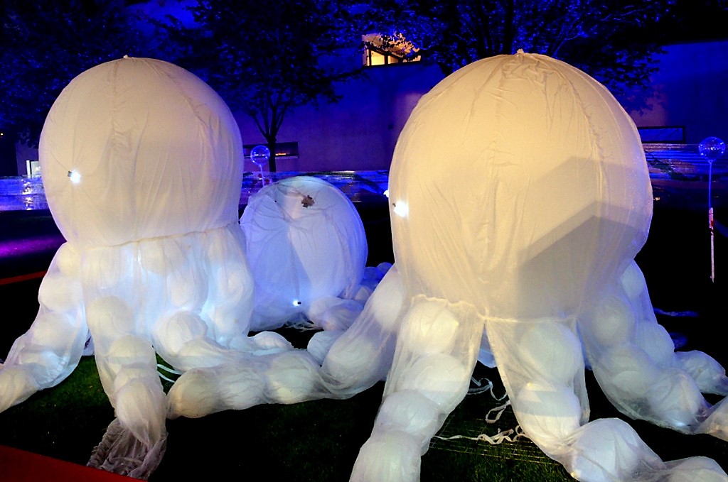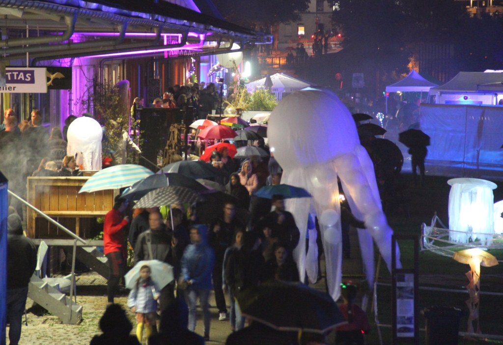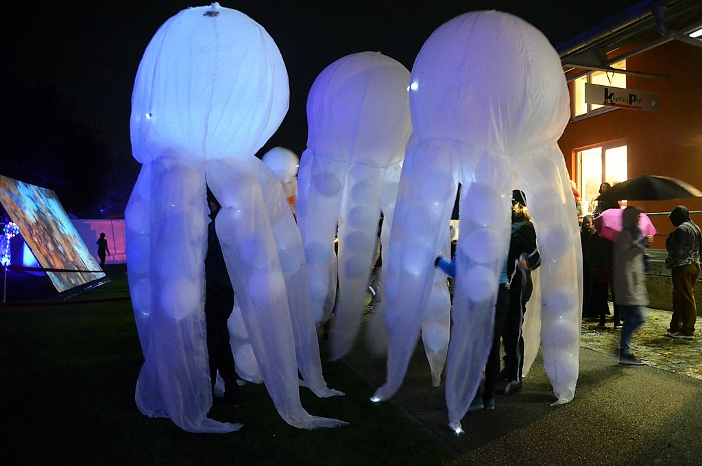 Ein absoluter Hingucker waren ebenfalls die drei Riesenoktopusse, die Karen Ulrich als Walking Act durch den Südpark treiben ließ. Schüler der Ballett-Schule Angel Blanco tanzten in einer Performance als Schattenwesen mit Schleier hinter einer Wand verborgen vor dem Atelier von Régis Noël. Große beleuchtete Fische und andere Wassertiere flogen vor den Ateliers.