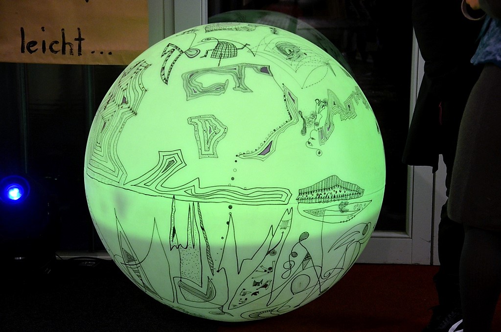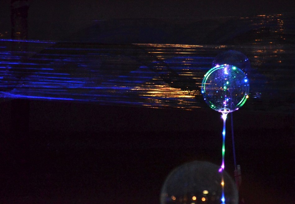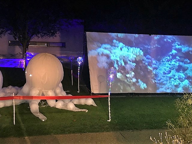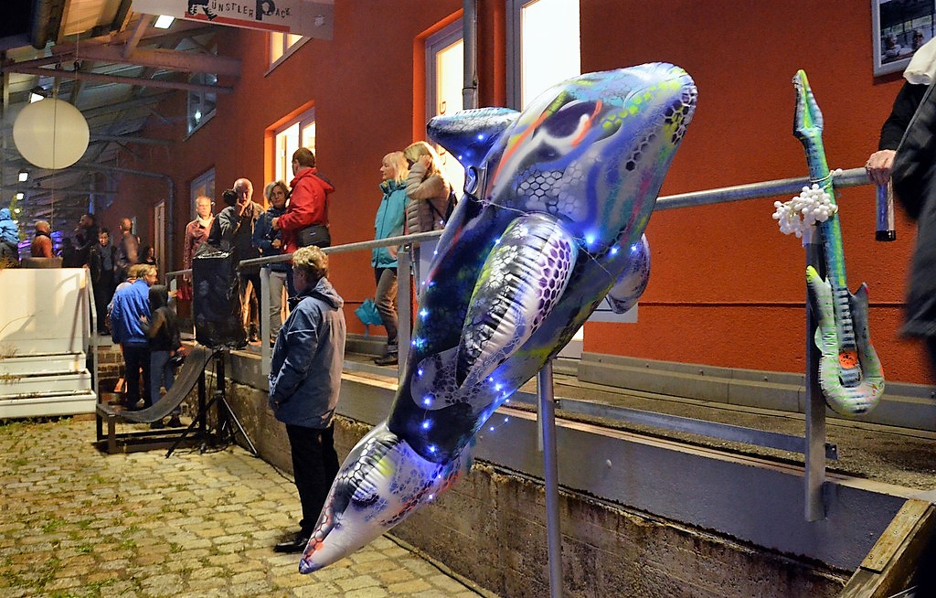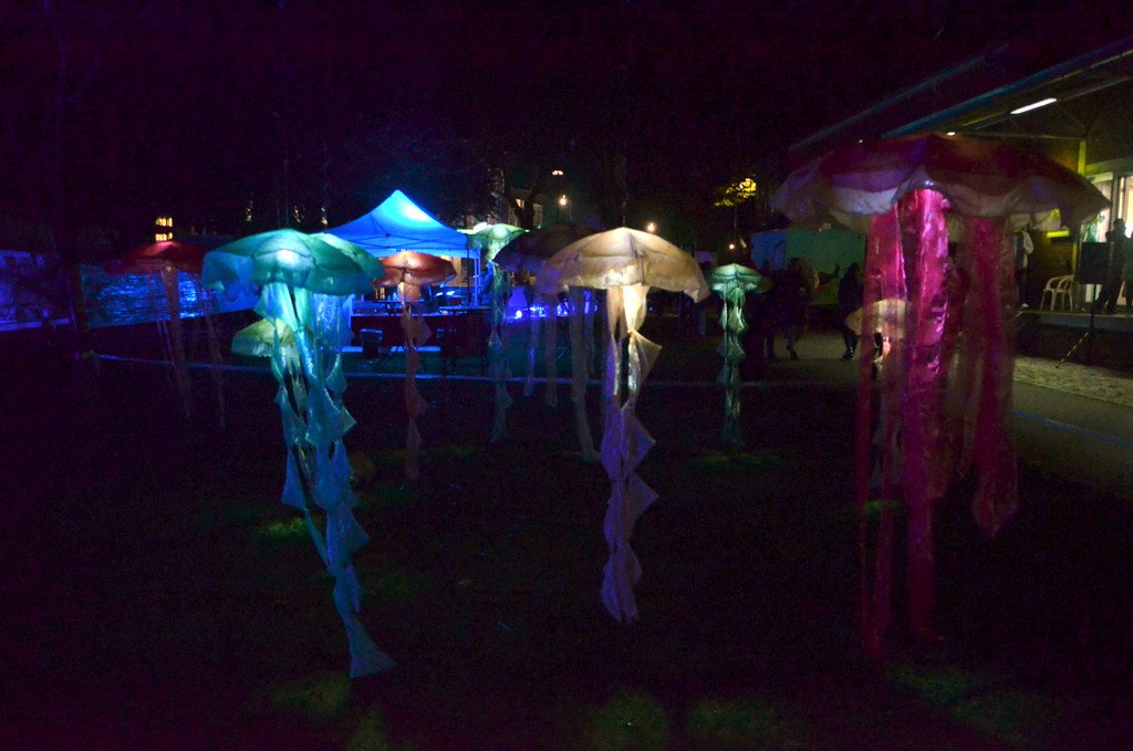Während Peter Amann im Vorfeld noch überlegt hatte, wie er seine geplanten Quallen herstellen sollte, kam ihm ein glücklicher Zufall zu Hilfe. Die Aricon GmbH spendete 14 alte Deckenlampen mit einen Durchmesser von 1,10 Meter. Aus einem Teil dieser Lampen sind Quallen auf Drahtgestellen in unterschiedlichen Höhen entstanden. „Dann habe ich 15 Folien zerschnitten und vier Tage lang Tentakel geknüpft“, berichtete Amann. Das Ergebnis war auf jeden Fall großartig. Es gibt schon Anfragen nach diesen Quallen für andere Festivitäten.