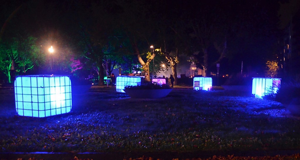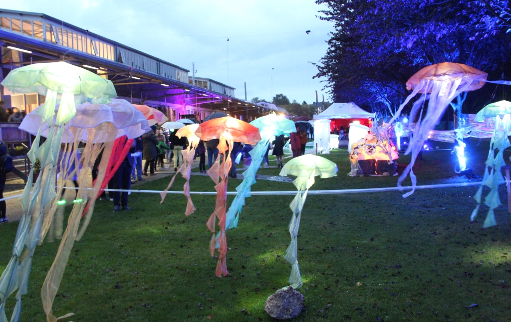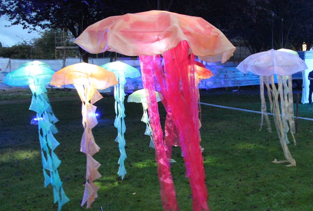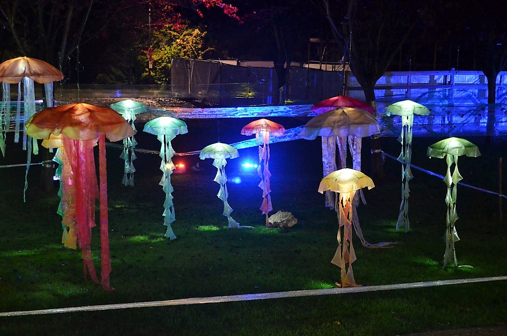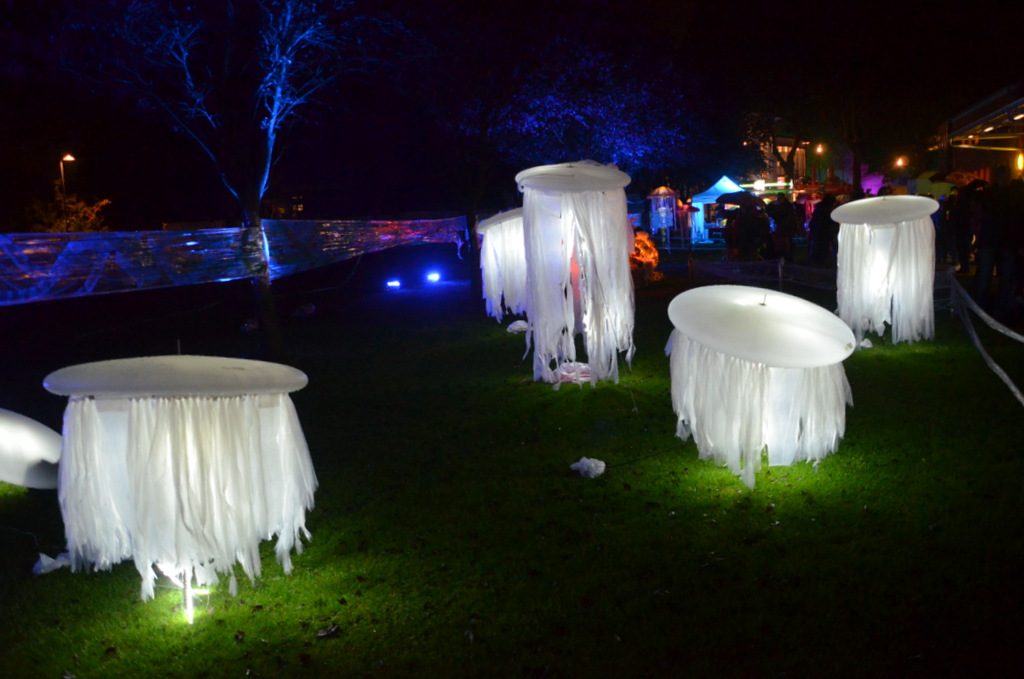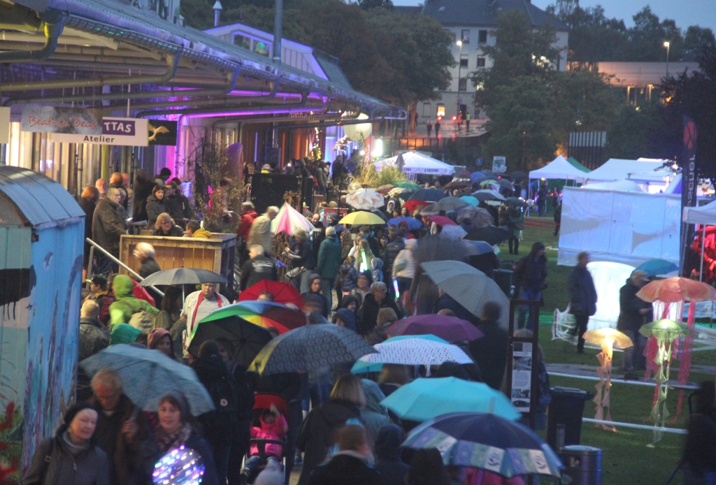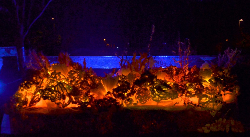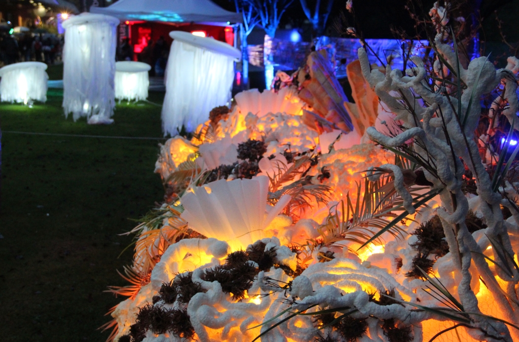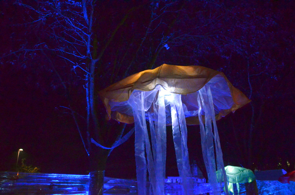 Das diesjährige Motto „Meer Licht“ war fantasievoll umgesetzt worden. Quallen wiegten sich in der Luft und ließen ihre Tentakel im Wind wehen. Wasserteppiche plätscherten mit Licht in Szene gesetzt. Die Künstler der Güterhallen hatten das Motto anlässlich des Internationalen Jahres des Riffs gewählt. Mit einer 5 x 2,50 Meter großen Skulptur wollten sie darauf aufmerksam machen, wie schützenswert dieser einzigartige Lebensraum ist. „Es ist eine Mischung aus Korallenriff und vulkanischem Gestein geworden“, erklärte Beatrix Deus. Das Werk trägt den Titel „Riff Obscure“ und lieferte durch die Beleuchtung im Inneren einen großartigen Special Effect. Rund 40 – 50 Stunden Arbeit hatten die Künstler hier investiert. Später soll es wahrscheinlich in einzelnen Deko-Elementen verkauft werden.