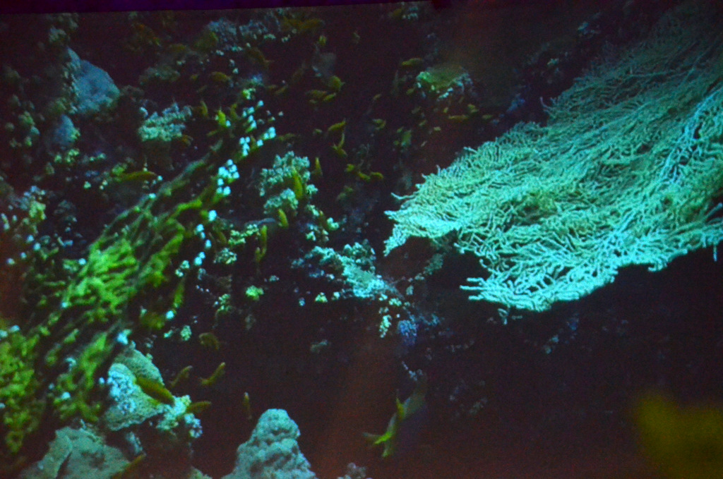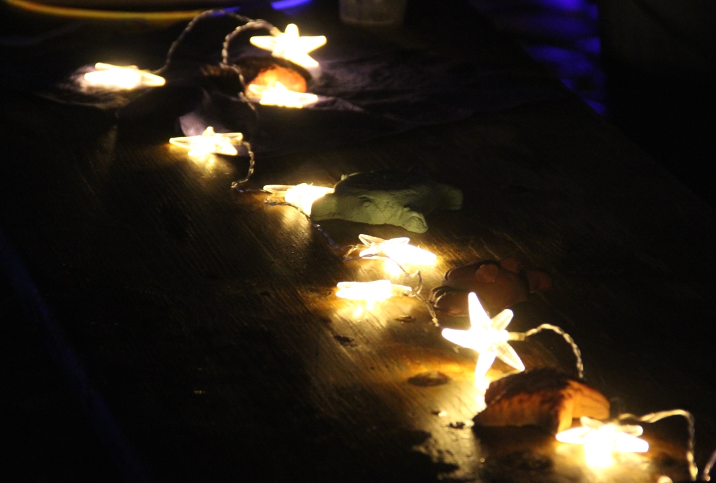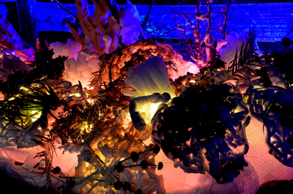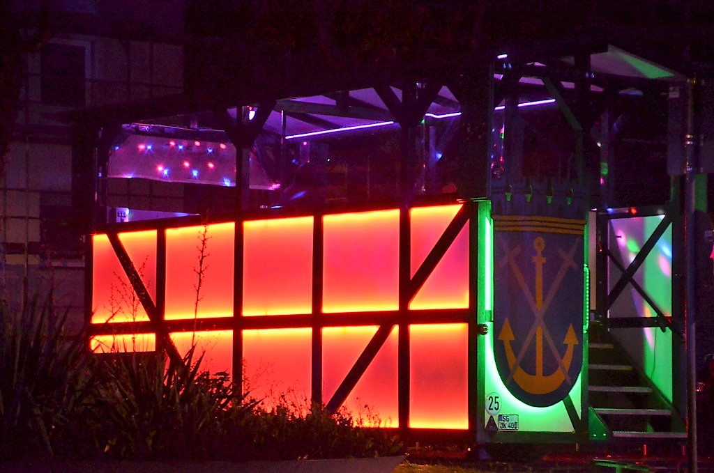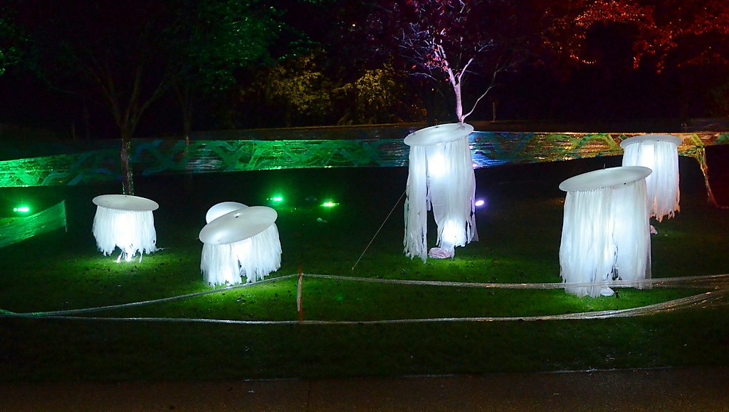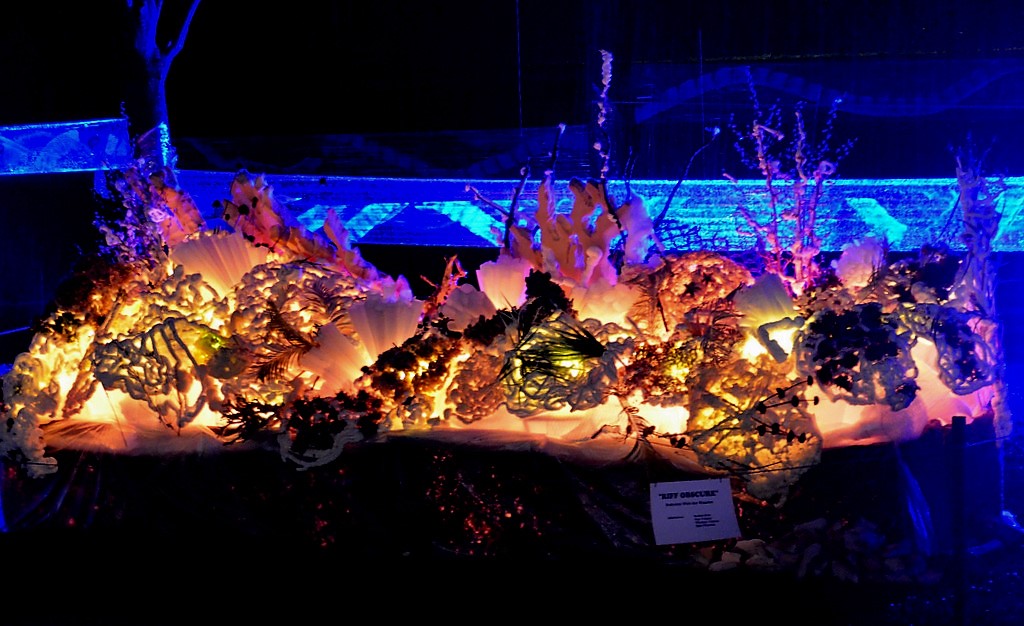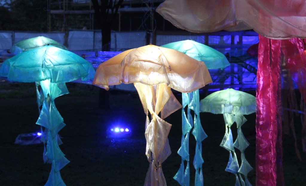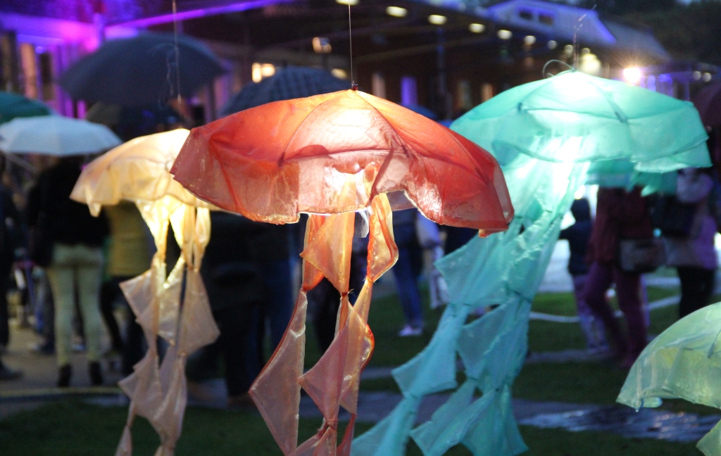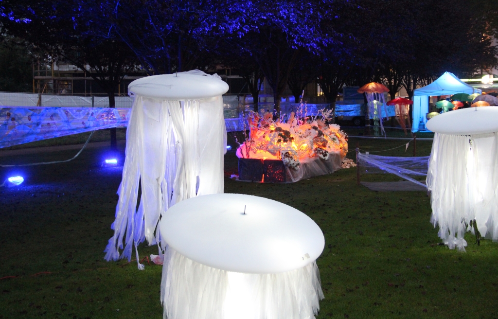 Das diesjährige Motto „Meer Licht“ war fantasievoll umgesetzt worden. Quallen wiegten sich in der Luft und ließen ihre Tentakel im Wind wehen. Wasserteppiche plätscherten mit Licht in Szene gesetzt. Die Künstler der Güterhallen hatten das Motto anlässlich des Internationalen Jahres des Riffs gewählt. Mit einer 5 x 2,50 Meter großen Skulptur wollten sie darauf aufmerksam machen, wie schützenswert dieser einzigartige Lebensraum ist. „Es ist eine Mischung aus Korallenriff und vulkanischem Gestein geworden“, erklärte Beatrix Deus. Das Werk trägt den Titel „Riff Obscure“ und lieferte durch die Beleuchtung im Inneren einen großartigen Special Effect. Rund 40 – 50 Stunden Arbeit hatten die Künstler hier investiert. Später soll es wahrscheinlich in einzelnen Deko-Elementen verkauft werden.