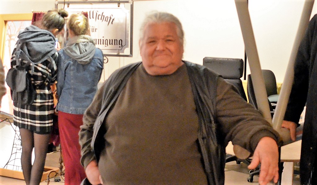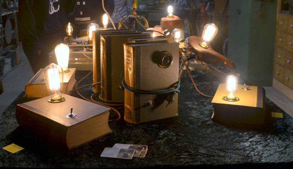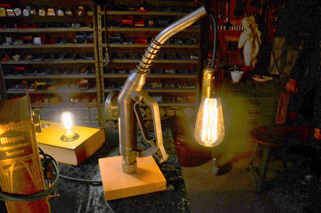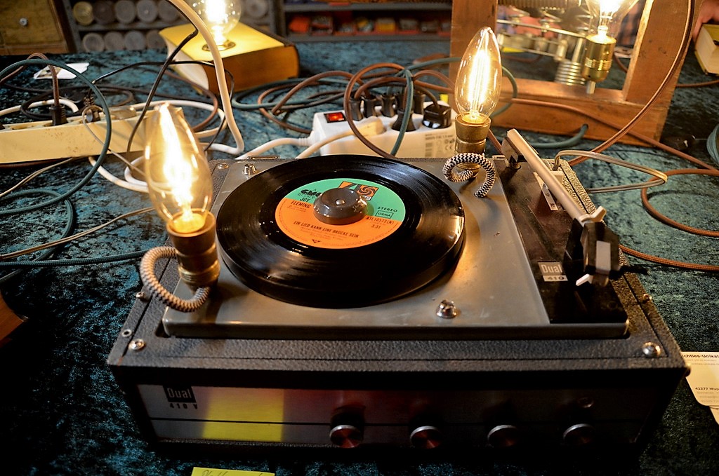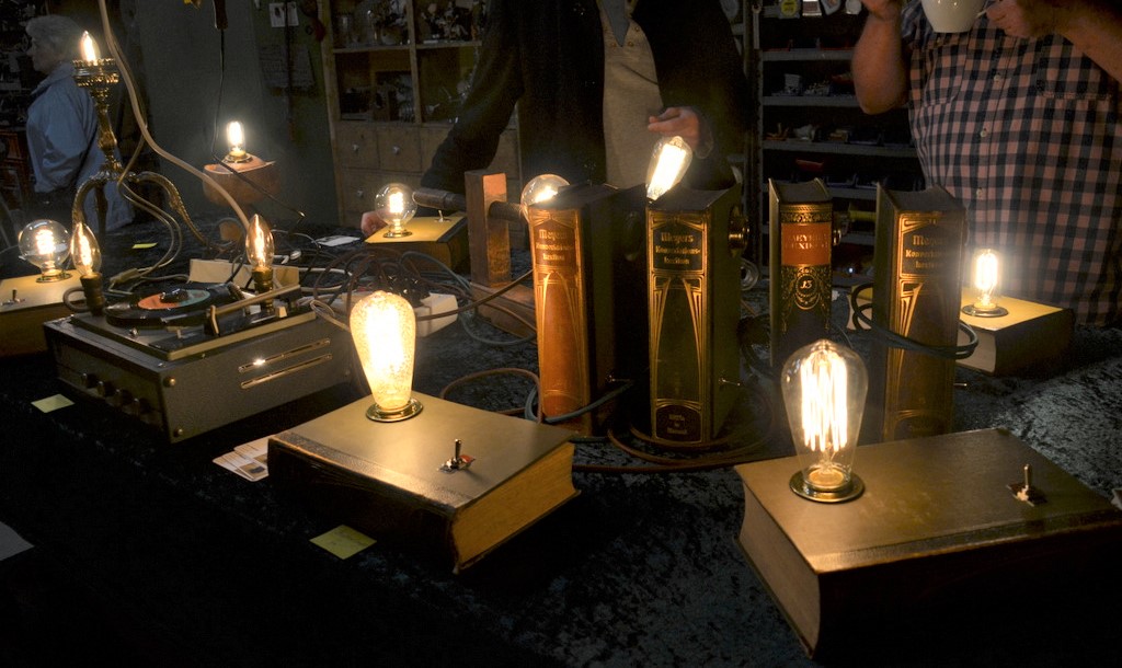 Gleichzeitig stellte in Amanns Werkstatt Michael Lichtenstein ungewöhnliche Licht-Unikate aus. Der gelernte Stahlhochbau-Konstrukteur betreibt diese Arbeit als reines Hobby in seinem Keller. Aus alten Büchern, hier Meyers Universallexikon von 1905 – 1906, sind ausgefallene Lampen entstanden, jedes Teil ein Unikat. Doch der Hobbykünstler hat nicht nur Bücher für seine Lampen verwendet, sondern auch tragbare Plattenspieler und sogar einen alten Zapfhahn.