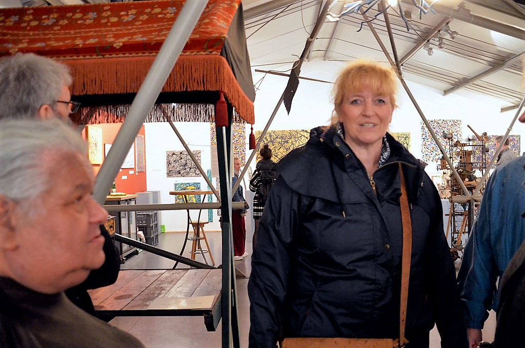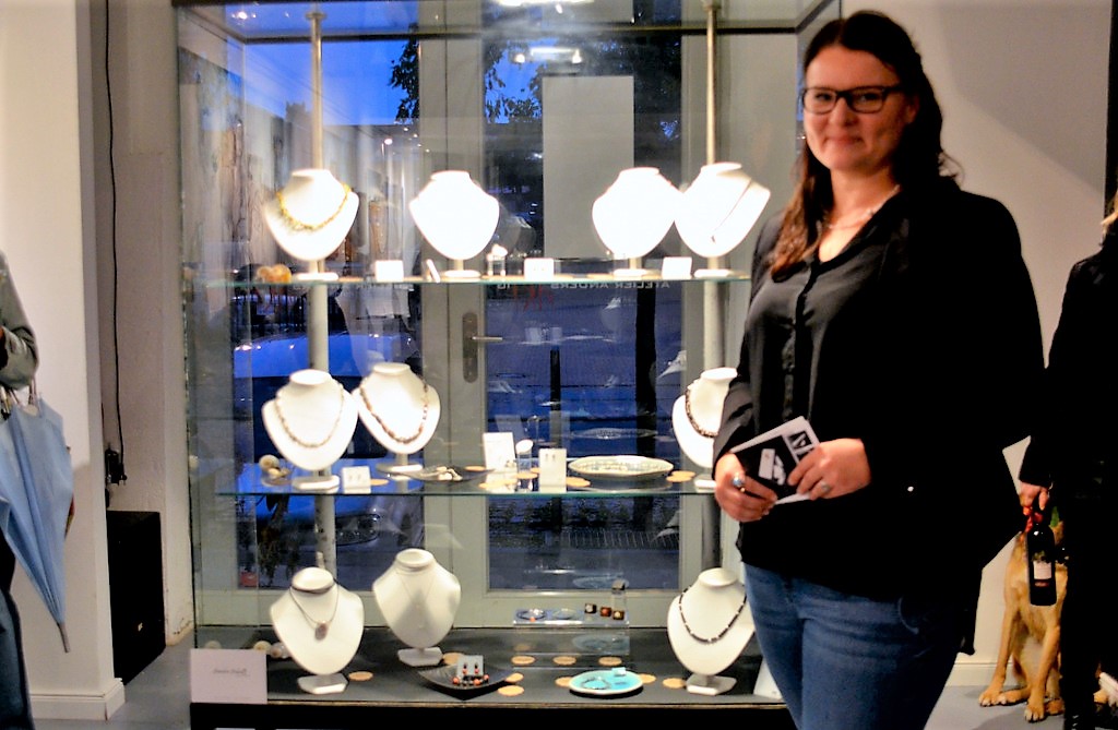 Vor dem Atelier AndersARTig lief auf einer riesigen Leinwand ein Unterwasserfilm. „Markus Soblik, ein Freund von uns, ist begeisterter Tiefseetaucher“, erzählte Janine Werner. Bei seinen Tauchgängen hat er immer die Kamera dabei. Einen Teil der eindrucksvollen Aufnahmen hatte er für diesen Abend zur Verfügung gestellt. Im Inneren des Ateliers stand eine große Vitrine mit dekorativen Schmuck-Innenleben. Goldschmiedin Sandra Schultz stellte zum ersten Mal einen Teil ihrer Schmucksachen aus. Die Vitrine wird noch einige Zeit im Atelier stehenbleiben.