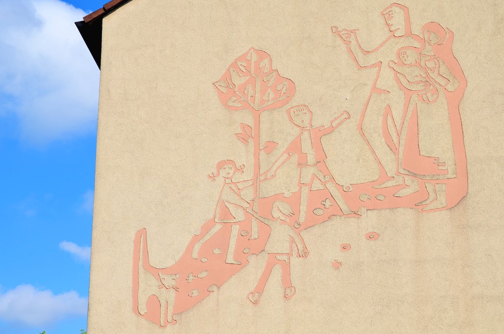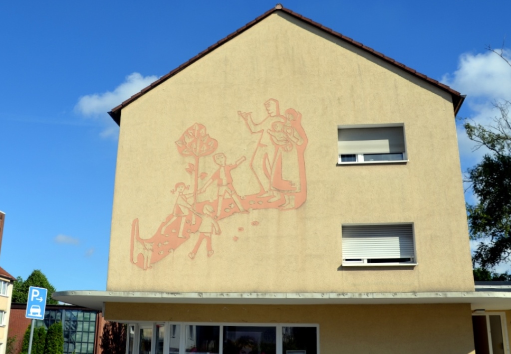 Wer am Haus an der Guntherstraße Ecke Kriemhildenstraße vorbeikommt, sollte unbedingt einen Blick nach oben werfen. Die Fassade ist mit einem ganz besonderen Wandschmuck gestaltet. Eine heitere Szene zeigt Eltern, spielende Kinder und im Vordergrund eine Katze. Sparsam und akzentuiert gemalt, wirkt alles idyllisch und harmonisch. Dieses Gemälde schuf die Künstlerin direkt vor Ort. Wie bei vielen ihrer Werke zeigt sich auch hier ihre besondere Vorliebe für die Motive Kinder und Tiere. Dabei beschränkte sie sich auf klare Formen. Mit wenigen eingesetzten Mitteln erzielte sie eine umso größere Wirkung. Zusätzliche dekorative Elemente findet man bei ihren Arbeiten nicht.
