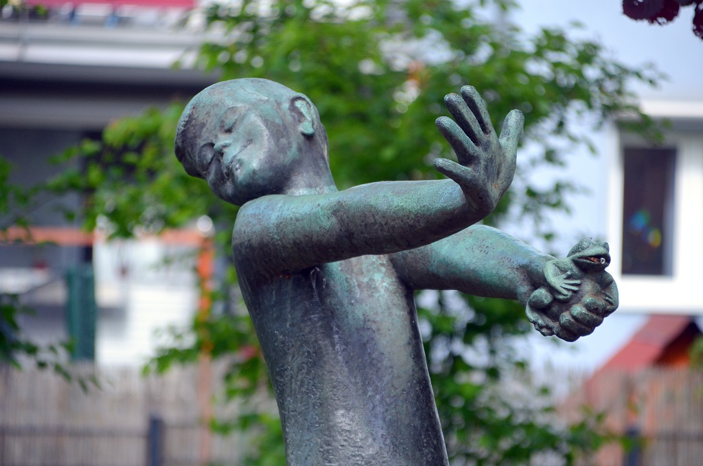 Ursprünglich saß der Dichter, mit Stift und Notizbuch in der Hand, auf einer Steinbank am Brunnenrand. Ein kleiner Vogel leistete ihm Gesellschaft. Im Zuge der Neugestaltung des Alten Marktes wurde der Brunnen abgebaut und die etwa sechs Zentner schwere Bronzestatue auf einem stylischen Glaskubus abgesetzt. Nicht gerade die optimale Platzwahl.