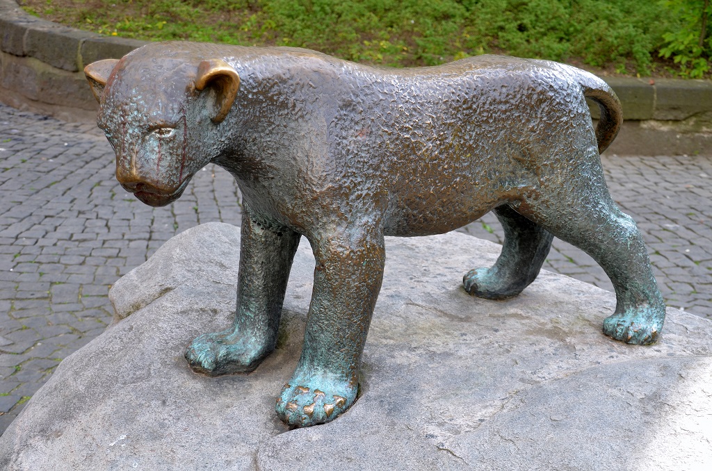 Der kleine Bronzelöwe am Fronhof steht auf einem, von Egon Ernst Oslender bearbeiteten Steinfindling. Die Plastik ist einem Löwenkind aus dem Dresdner Zoo nachempfunden. Nach Fertigstellung 1974 wurde die Statue zunächst provisorisch am Mühlenplatz aufgestellt, zog jedoch Ende 1975 auf den Fronhof um. Sie war ein Geschenk vom Lions-Club an die Stadt Solingen zum 600. Geburtstag.