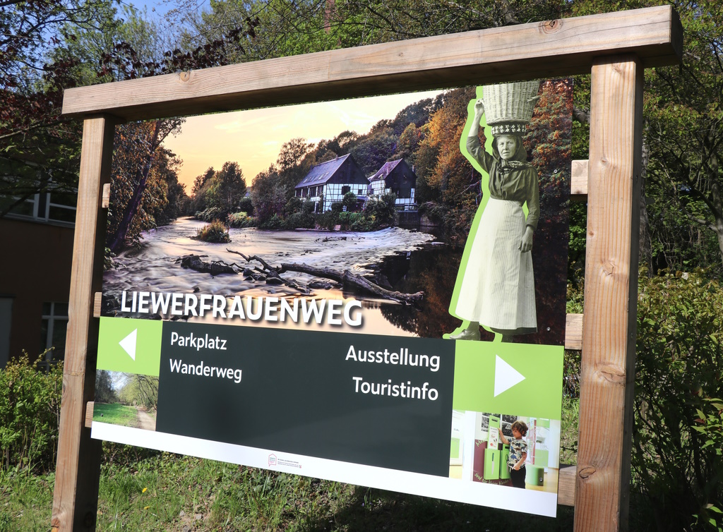 Als neues Wahrzeichen des GuT steht jetzt eine Skulptur der Liewerfrau neben dem Eingang zur Ausstellung. Zehn Informationstafeln zu Kotten, Hofschaften, Wasserburgen und ähnlichen Themen begleiten den Weg. So erfahren die Wanderer, dass es im 19. Jahrhundert eine Firma „Birmingham“ in Solingen gab und was das mit „Made in Germany“ zu tun hat.