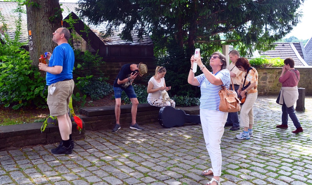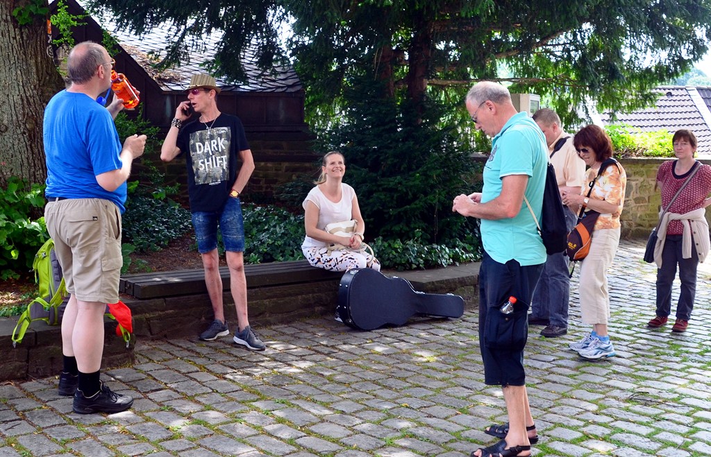 Mitglieder des Freien Deutschen Autorenverbandes und der Solinger Autorenrunde wanderten am Samstag durch das schöne Gräfrath. An ausgewählten Plätzen lasen sie eigene Texte. Musikerin Teneja begleitete die Tour musikalisch. (Foto: © Martina Hörle)