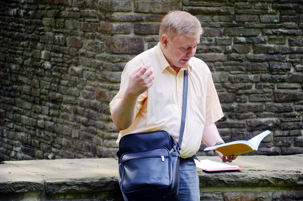 Viel Ruhe zum Lesen gab es nicht mehr. Also beschloss die Gruppe kurzerhand, vor das Museum zu gehen. Dort allerdings standen mehrere Gruppen, die der Lossprechung von frischgebackenen Handwerksburschen beiwohnen wollten. Kein wirklich geeigneter Platz zum Lesen. Eine kurze Strecke weiter gab es ein unüberhörbares Hindernis in Form eines Rasenmähers. Ein Kantenschneider leistete lautstark Gesellschaft.