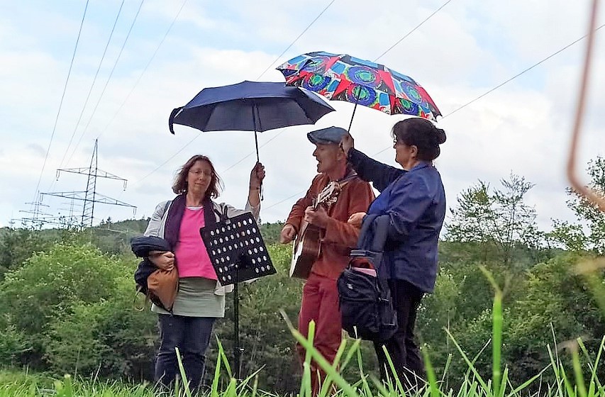 Nach diesem doch etwas bedrückenden Text setzte ein leichter Regen ein und ließ seine Tropfen auf den Musikus fallen, der zum Abschied noch ein Lied spielen wollte. Schnell wurde dieser mitsamt seiner Gitarre links und rechts von eifrigen Damen beschirmt. Dieser amüsante Anblick schuf eine heitere Stimmung und sorgte gleich für Vorfreude auf die nächste literarische Runde in der Natur. Diese ist für den April 2022 geplant. Nähere Informationen werden rechtzeitig bekanntgegeben.