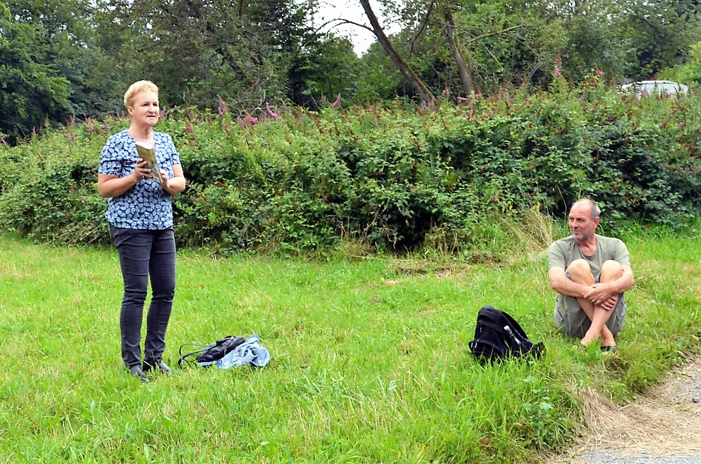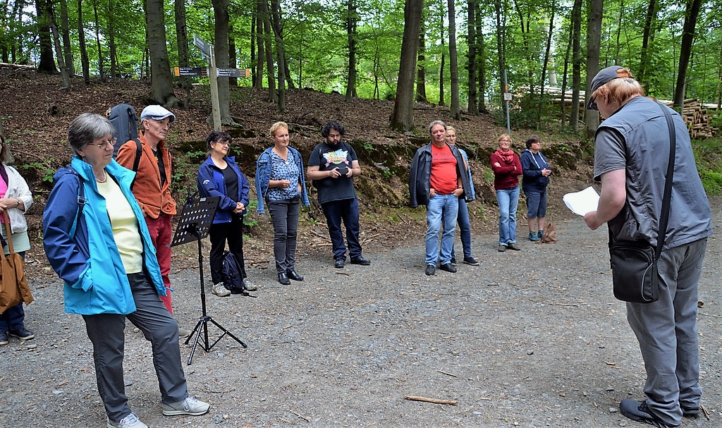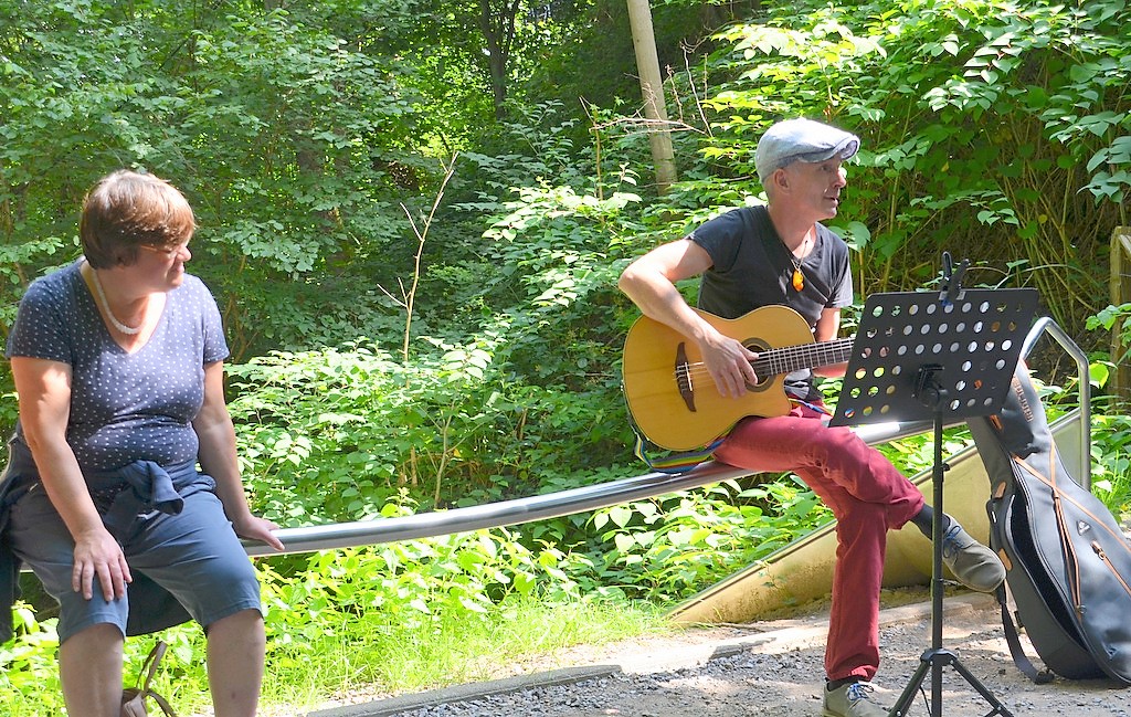 Am Spiel- und Bewegungsplatz gleich bei der Rutsche gab Ganahl in seinem Sachtext zu bedenken, dass kein Mensch ernsthaft von sich behaupten solle, er sei perfekt. Sogar Bäume seien größer als der Mensch selbst. Dann sang Bernd Möller von Sonnenstrahlen, die durch bewegte Wellen fallen und gab zu: „Ich möchte eine Blume sein.“ In dieser lockeren Stimmung ging es abwärts zum nächsten Lesepunkt. Nachdem die Zuhörer es sich auf umgefallenen Stämmen bequem gemacht hatten, nahm Martina Hörle sie mit in eine Parallelwelt, in der die Zeit keine Bedeutung hat. Die Erzählung „Zauber im Kotten“ handelte von einem jungen Mann, der in einem alten Kotten jenseits der Zeit gelandet war und von einer alten Linde beschützt wurde.