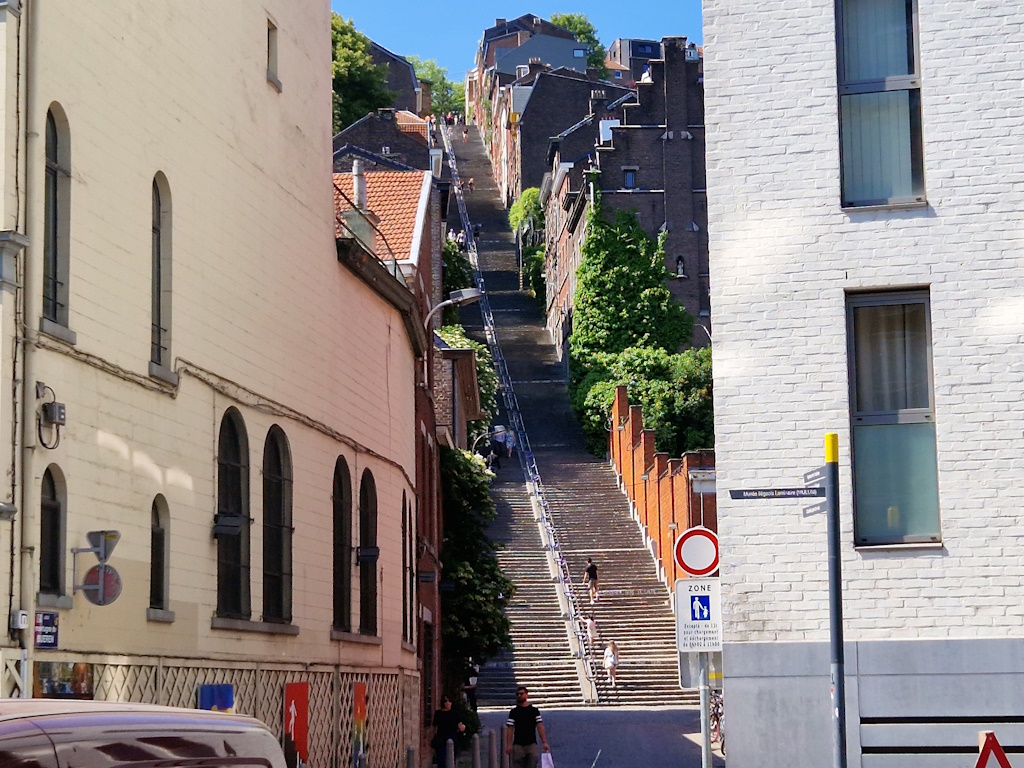 Natürlich haben wir die Kirche St. Barthelemy, das Kollegium St. Denis und den Palast der Fürstbischöfe, der heute ein Gericht und Sitz der wallonischen Regierung ist, nicht übersehen. Eine der großen Sehenswürdigkeiten der Stadt, die ganz oben auf unserer Liste stand, ließen wir bis zum Schluss übrig – den „Bueren-Berg“. Diese eindrucksvolle Treppe beginnt im Or-Chateau-Viertel und führt hinauf auf einen Hügel, auf dem sich vor Hunderten von Jahren eine Festung befand. Dort ist heute der Zitadellenpark, es gibt noch alte Bauelemente und Festungsmauern zu sehen. Um all das persönlich in Augenschein nehmen zu können, müssen Besucher 374 Stufen hinaufsteigen. Im Gegensatz zu meinen Begleitern erschreckte mich die Zahl der Stufen nicht. Aber mein Entschluss, den „Montagne de Bueren“, benannt nach dem Adligen Vincent de Bueren, der im Oktober 1468 den Aufstand gegen den burgundischen Herzog Karl den Kühnen anführte, zu erobern, hielt nicht an lang.