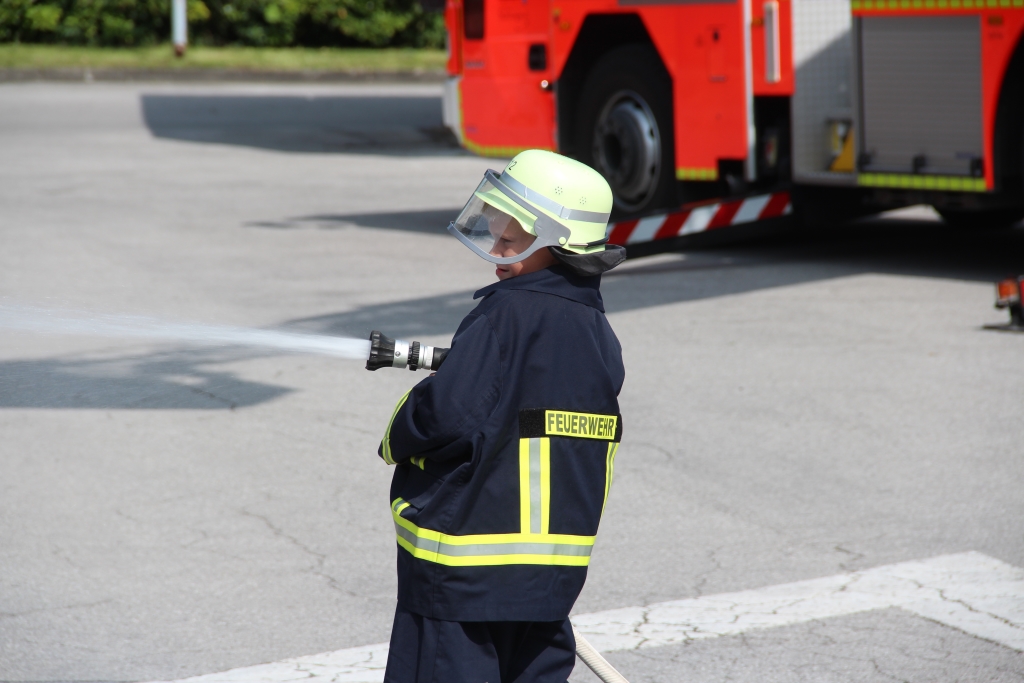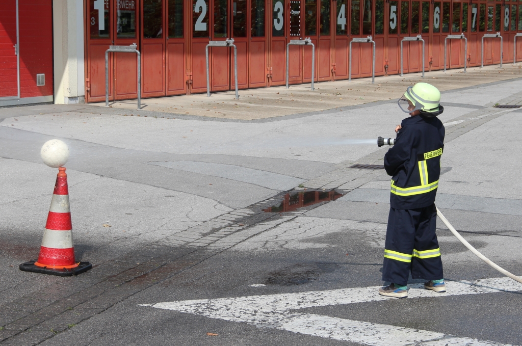 Auf dem Hof der Wache ging es mit der Drehleiter weiter. Im Korb des Vehikels konnten sich die Ferienspass-Kinder selbst davon ein Bild machen, wie es ist, einige Meter über der Erde zu schweben. Höhepunkt des Tages bei der Feuerwehr waren freilich die Wasserspiele: Mädchen traten gegen Jungs an und zeigten das Erlernte ganz praktisch beim „Löschen“ eines Volleyballs im Rahmen eines kleinen Wettbewerbs.