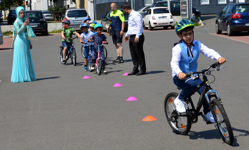 SOLINGEN (mh) – Rund 10 Kinder der KiTa Scheidter Feld kamen gestern mit ihren Eltern zum nahe gelegenen Lidl-Parkplatz. Daniela Berghaus und Ulrich Schmidt vom Solinger Team der Verkehrssicherheitsberater hatten zum Radfahrtraining eingeladen. Die kleinen Radler waren schon sehr gespannt und auch ein bisschen aufgeregt.