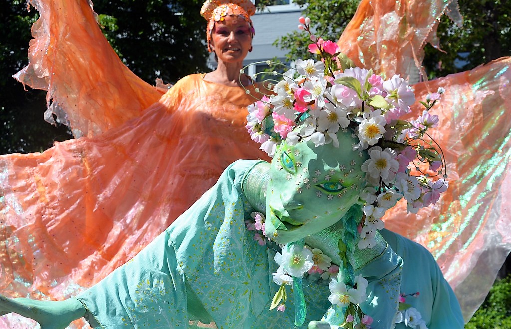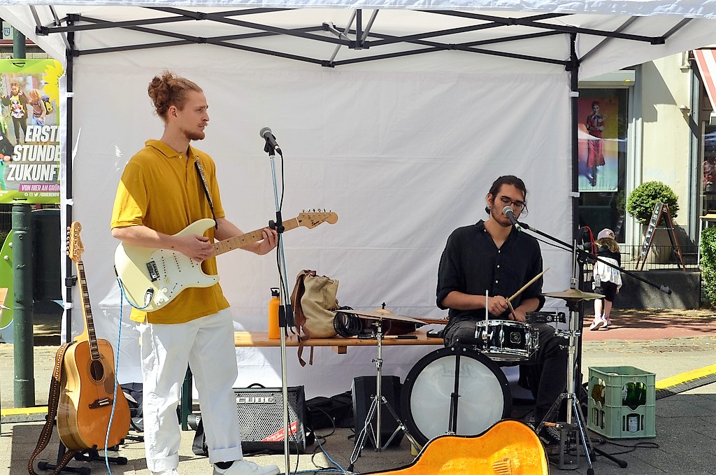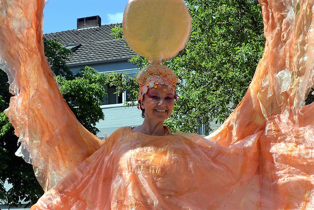 Die floralen Stelzenläufer Pantao aus Zülpich bildeten mit ihren strahlenden Outfits einen absolut faszinierenden Hingucker. Wann sieht man schon zum Leben erwachte Riesenblumen in solcher Anmut über den Fronhof schweben? „Acoustic Club“ sorgte im blauen Latzhosen-Outfit mit schwungvollen Songs für gute Laune. Die Solinger Band „Doysel“ schuf auf ihre eigene musikalische Weise den passenden Rahmen. Auch vom Alter Markt her erklang Musik.