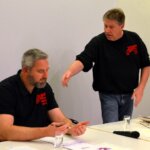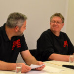 Den zweiten Teil des Abends übernahmen zwei der Krimi-Cops: Carsten Rösler und Klaus Stickelbroeck. Ihre Kollegen Martin Niedergesähs und Ingo Hoffmann mussten passen, doch das tat der Stimmung keinen Abbruch. Die witzig-spannenden Kriminalromane der Krimi-Cops, die in Düsseldorf spielen, beruhen auf kuriosen Anekdoten aus dem echten Polizeialltag. Alles etwas abgewandelt, aber immer mit einem Augenzwinkern. Mal geschieht Ernstes, mal Lustiges und ab und zu auch völlig Skurriles. Irgendwann hatte einer von ihnen gesagt: „Man müsste das mal alles aufschreiben.“ Das haben sie erfolgreich in die Tat umgesetzt.
