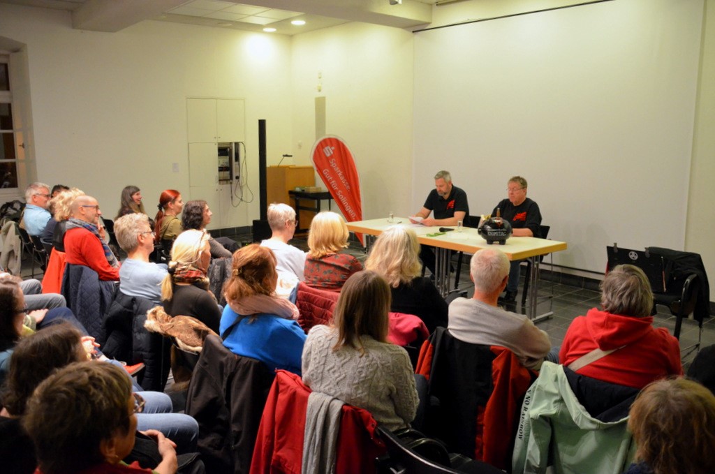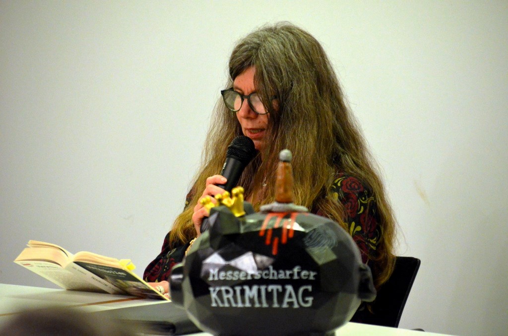Saga Grünwald begrüßte die rund 50 Besucher sehr herzlich und gab einen kurzen Ablauf des Abends bekannt. Die Autorin und freie Journalistin lebt seit 2007 in Solingen und ist nicht nur Mitglied im Syndikat, sondern auch bei den Mörderischen Schwestern und im Bergischen KrimiKartell. Dann las sie aus ihrem Buch „Verschollen im Bergischen Land“, dem zweiten Band ihrer Bergischen Krimireihe.