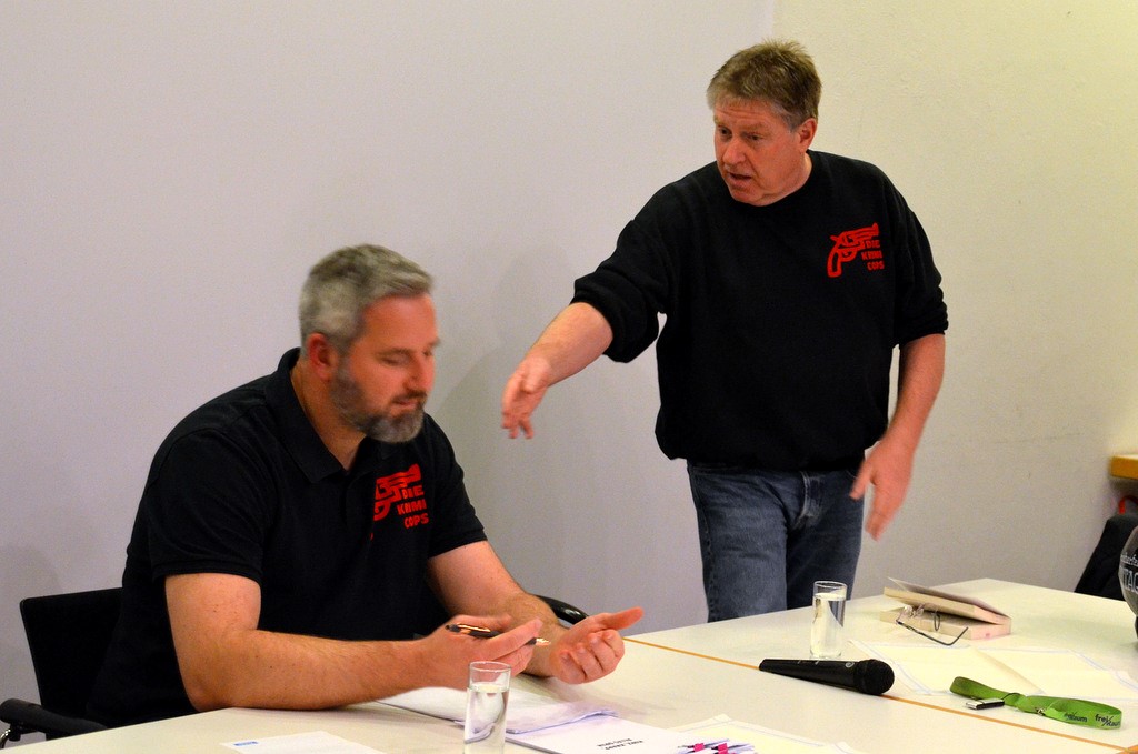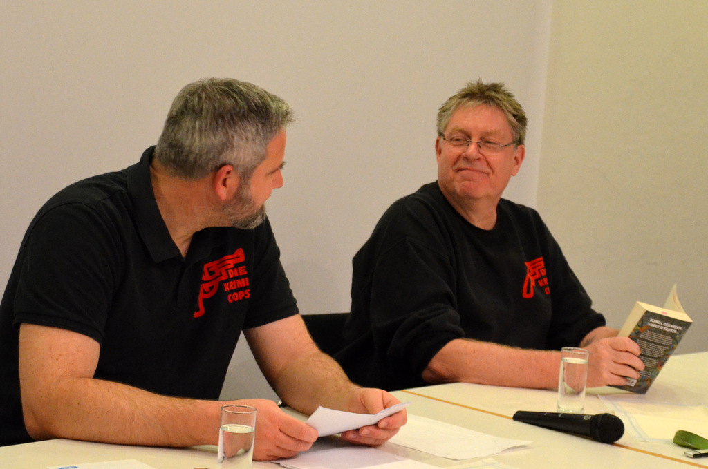 Den zweiten Teil des Abends übernahmen zwei der Krimi-Cops: Carsten Rösler und Klaus Stickelbroeck. Ihre Kollegen Martin Niedergesähs und Ingo Hoffmann mussten passen, doch das tat der Stimmung keinen Abbruch. Die witzig-spannenden Kriminalromane der Krimi-Cops, die in Düsseldorf spielen, beruhen auf kuriosen Anekdoten aus dem echten Polizeialltag. Alles etwas abgewandelt, aber immer mit einem Augenzwinkern. Mal geschieht Ernstes, mal Lustiges und ab und zu auch völlig Skurriles. Irgendwann hatte einer von ihnen gesagt: „Man müsste das mal alles aufschreiben.“ Das haben sie erfolgreich in die Tat umgesetzt.