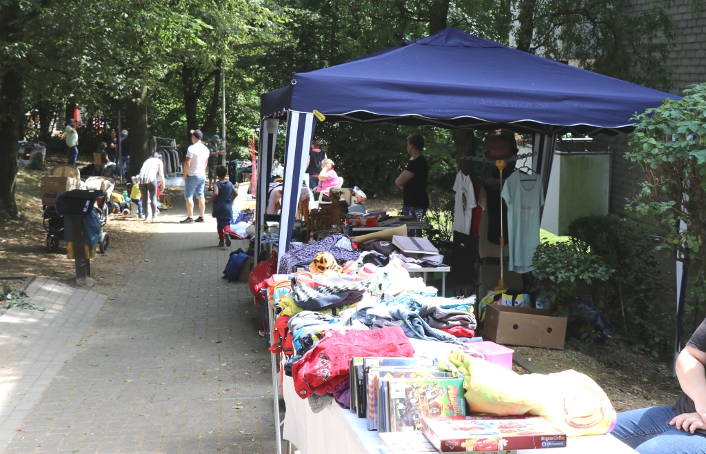 20 Stände gab es am Samstag beim Trödelmarkt in der Hasseldelle. Im Wendehammer der Rolandstraße wurde ein buntes Live-Programm präsentiert. (Foto: © Bastian Glumm)