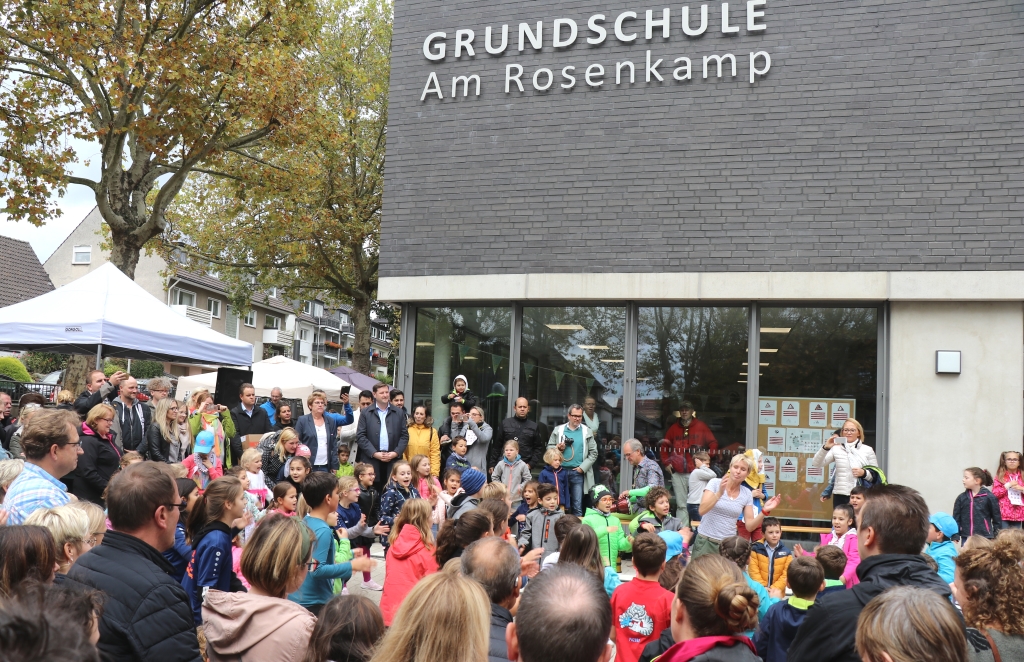 Und das machte sich gleich im Schulalltag bemerkbar: „Wir haben viel Platz, unsere Schüler entspannen sich, auf dem Schulhof beobachten wir tatsächlich schon jetzt weniger Konflikte“, so Anne Blessmann. 220 Mädchen und Jungs lernen an der Grundschule Am Rosenkamp, 150 davon in jetzt sechs Gruppen im Offenen Ganztag. Zahlreiche Gratulanten kamen am Samstag zur Feier in die Grundschule, auch Oberbürgermeister Tim Kurzbach nahm selbst am Rundgang durch den Neubau teil.