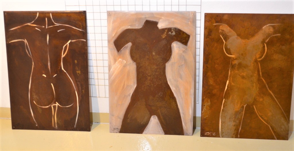 Stephan Mensler, gelernter Schlosser und Blecharbeiter, hat vor rund 20 Jahren die Kunst als Ausgleich zum Beruf entdeckt. Bei seinen Arbeiten hat er sich auf Stahlblech- und Acrylbilder spezialisiert. Dabei arbeitet er vornehmlich mit Cor-Ten-Stahl, ein Baustahl, der nur bedingt rostet. Neben der bereits im Sommer beim Steampunk-Festival ausgestellten 110 Kilo schweren Figur „Der Denker“ (wir berichteten), eine Gemeinschaftsarbeit mit Peter Wischnewski, bringt der Gastkünstler zwei weitere Skulpturen mit in die Ausstellung, außerdem eine einem alten Ölbild nachempfundene Stehlampe. 12 Stahlblech- und Acrylbilder komplettieren seine Werke.