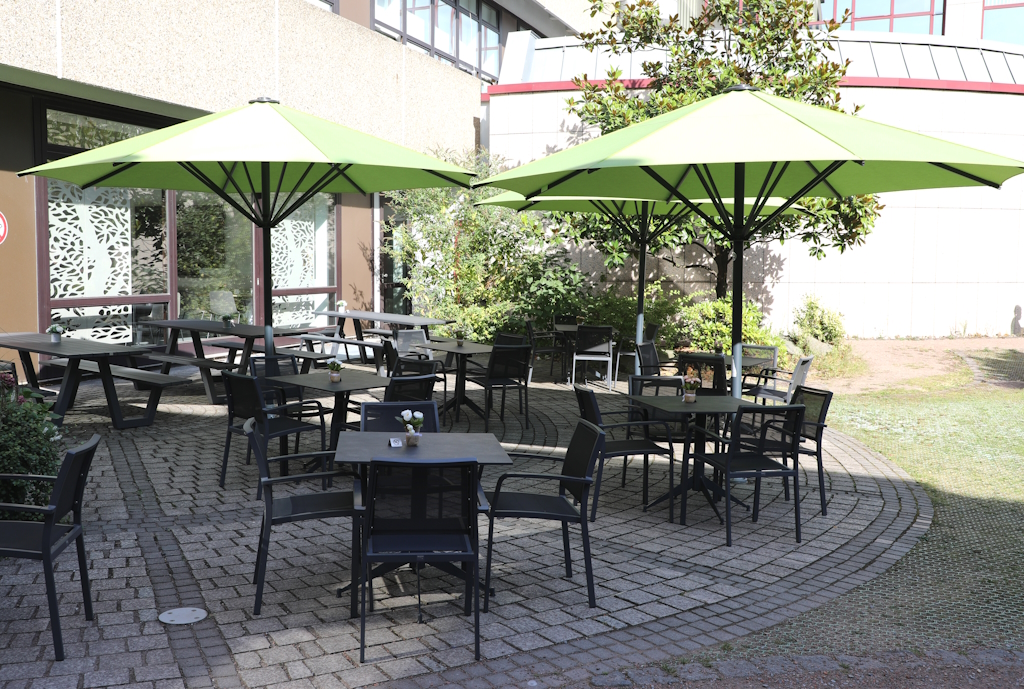 In der Cafeteria finden Sie eine Auswahl von Speisen und Getränken – vom Frühstück über Mittagessen bis hin zu Kaffee & Kuchen am Nachmittag. In den warmen Monaten lädt zudem die Terrasse im Innenhof des Campus vor der Cafeteria zum Verweilen ein.