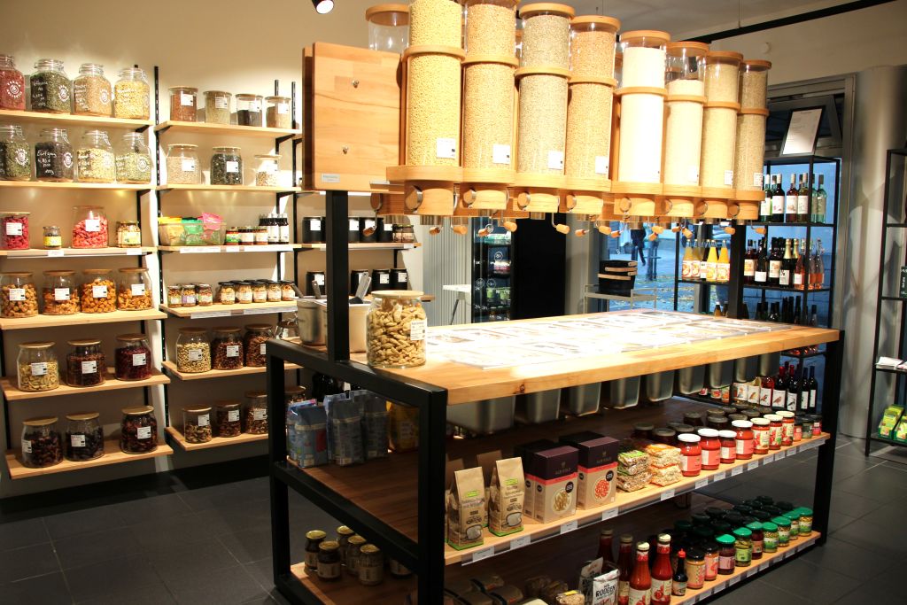 Hübsch gestaltet ist der Bereich des Unverpacktladens. In Glasbehältern sind die Sachen einladend präsentiert. Verschiedene Kaffee- und Teesorten gibt es hier genauso wie exotische Trockenfrüchte oder Nudeln in den unterschiedlichsten Ausformungen. Auch ein guter Tropfen Wein in Bioqualität darf natürlich nicht fehlen. Und sogar alkoholfreier Wein ist hier zu haben.