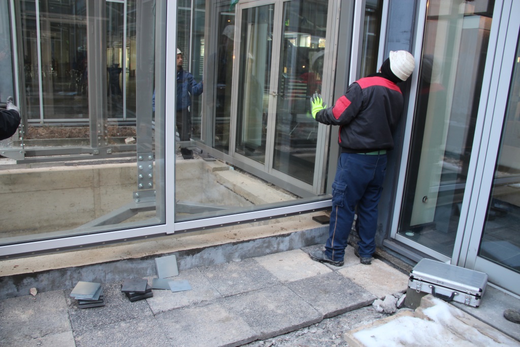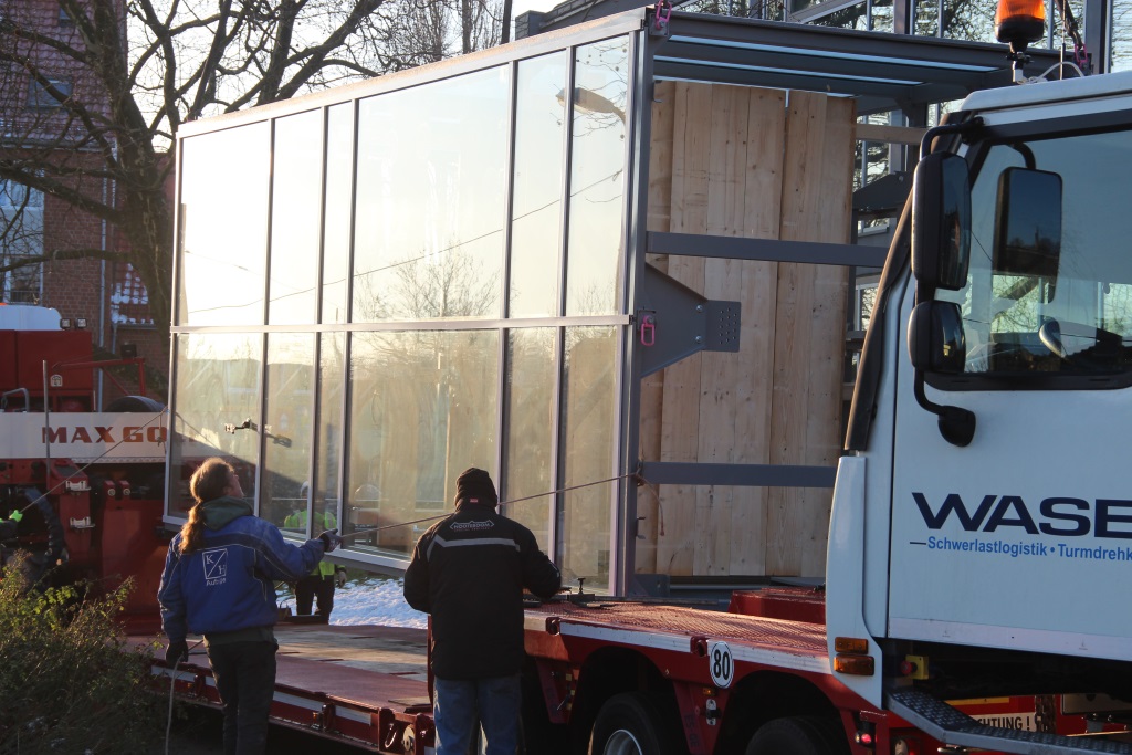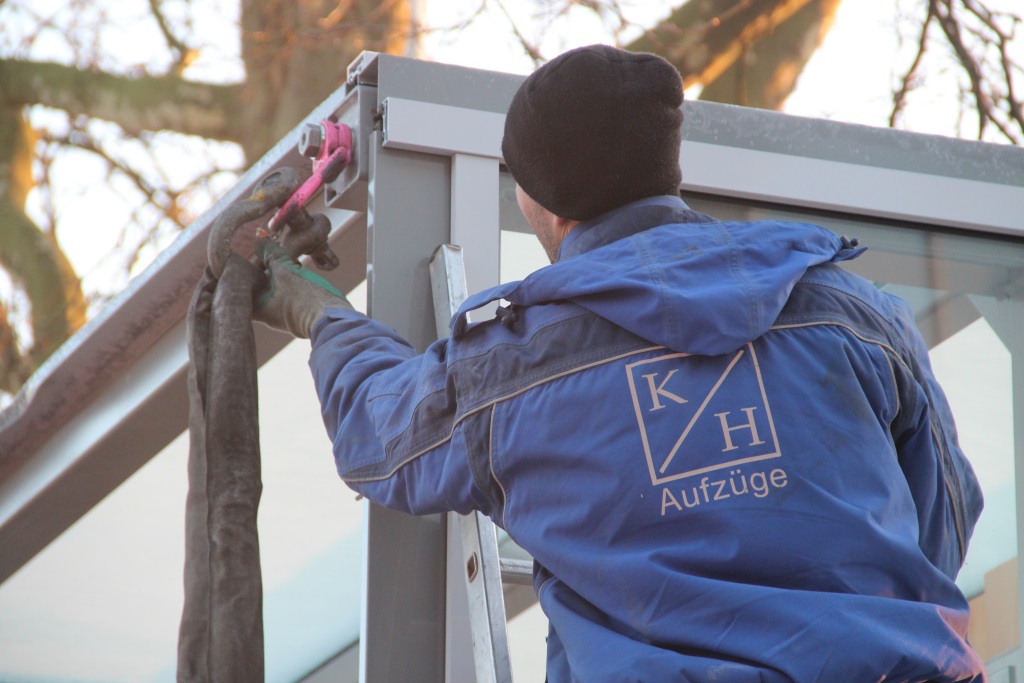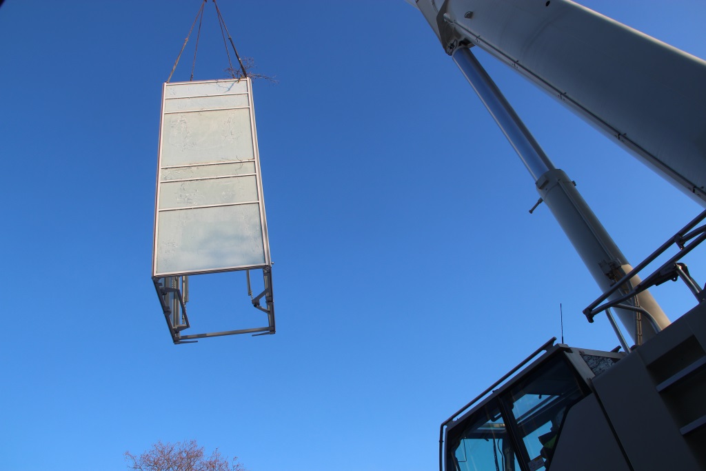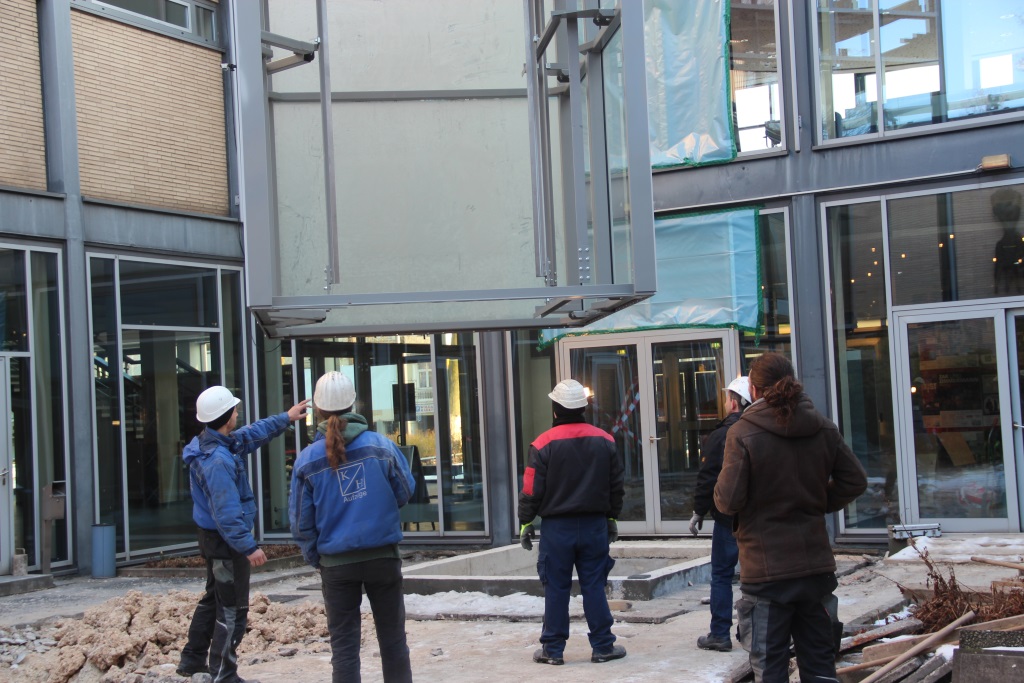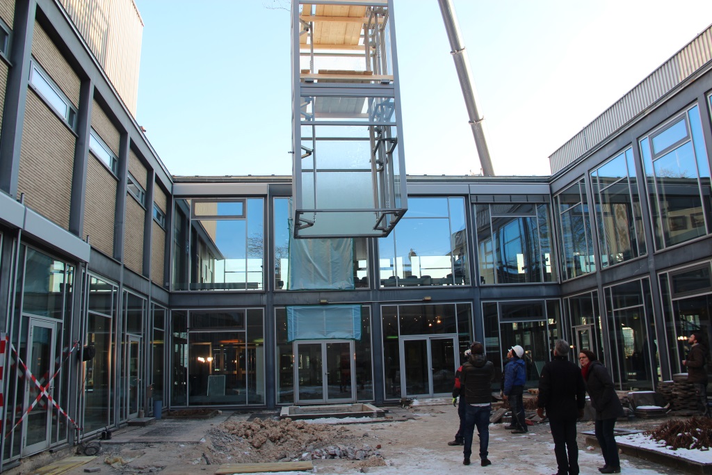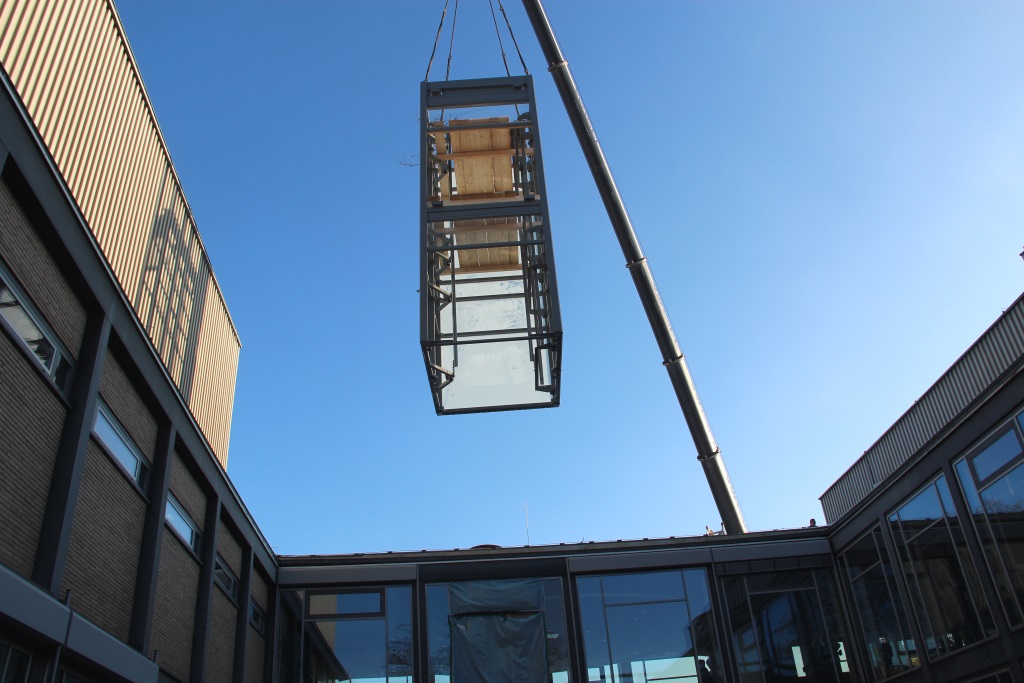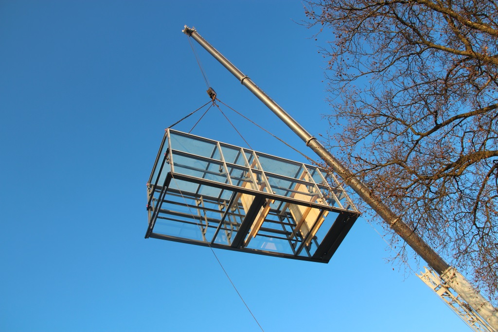 Dabei musste genauestens auf einen Baum geachtet werden, der dem Konstrukt zeitweise sehr nahe kam. Dann wurde das gläserne Gerüst jedoch über das Theater hinweg in den Innenhof gehievt. Spätestens dort hatte der Mann im Kran keinen direkten Sichtkontakt mehr und musste per Funk dirigiert werden. Dabei ging es teilweise um Zentimeter. Routiniert hatten die Düsseldorfer Aufzugexperten die Lage im Griff und konnten das Aufzuggerüst unbeschädigt an Ort und Stelle absetzen.