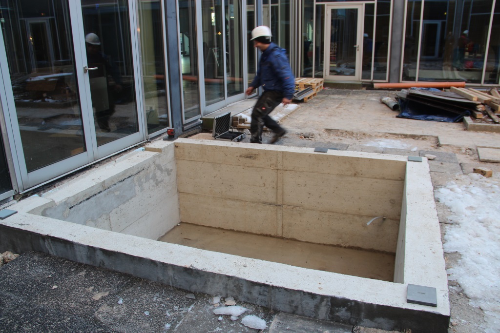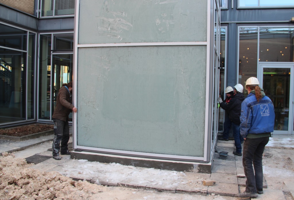 Lieferung und Einbau des Aufzuggerüstes war übrigens eine sprichwörtliche Punktlandung. Denn eine Zwischenlagerung im oder am Theater war unmöglich. Ein logistisches Bravourstück. Vorher musste jedoch für den Aufzug Platz geschaffen werden: „Im Innenhof haben wir zunächst den Brunnen entfernt und das war nicht ohne, weil wir dort sehr viel Beton hatten“, erklärte Stadtentwickler Markus Lütke Lordemann. Die Vorbereitungen zum Einbau des Aufzuges laufen bereits seit dem vergangenen Herbst.