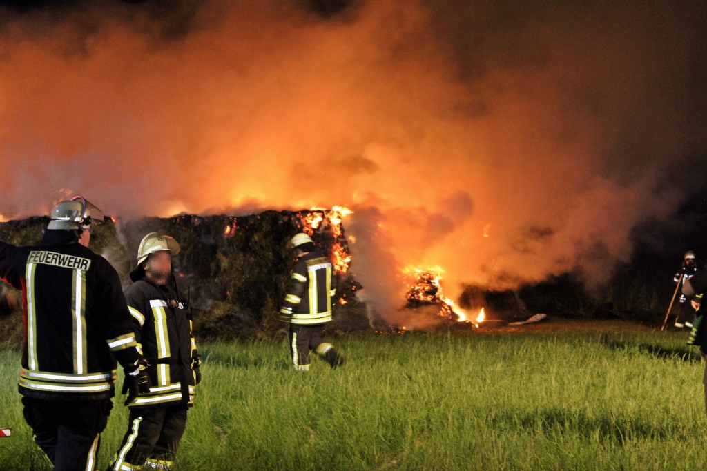 SOLINGEN/REMSCHEID (red/to) -Zwei größere Brandeinsätze hielten Feuerwehr und Polizei in Solingen und Remscheid gestern Abend in Atem: Gegen 21.10 Uhr brannten zunächst auf einem Feld an der Straße Angerscheid in Oberburg insgesamt etwa 80 Heuballen. Durch die starke Rauchentwicklung mussten während der Löscharbeiten zwei angrenzende Häuser geräumt werden. Die Bewohner konnten nach Abschluss der Löschmaßnahmen wieder unverletzt in ihre Häuser zurückkehren. Den entstandenen Schaden schätzten die Beamten auf etwa 4.000 Euro.