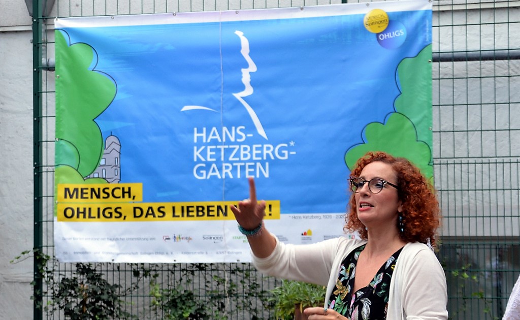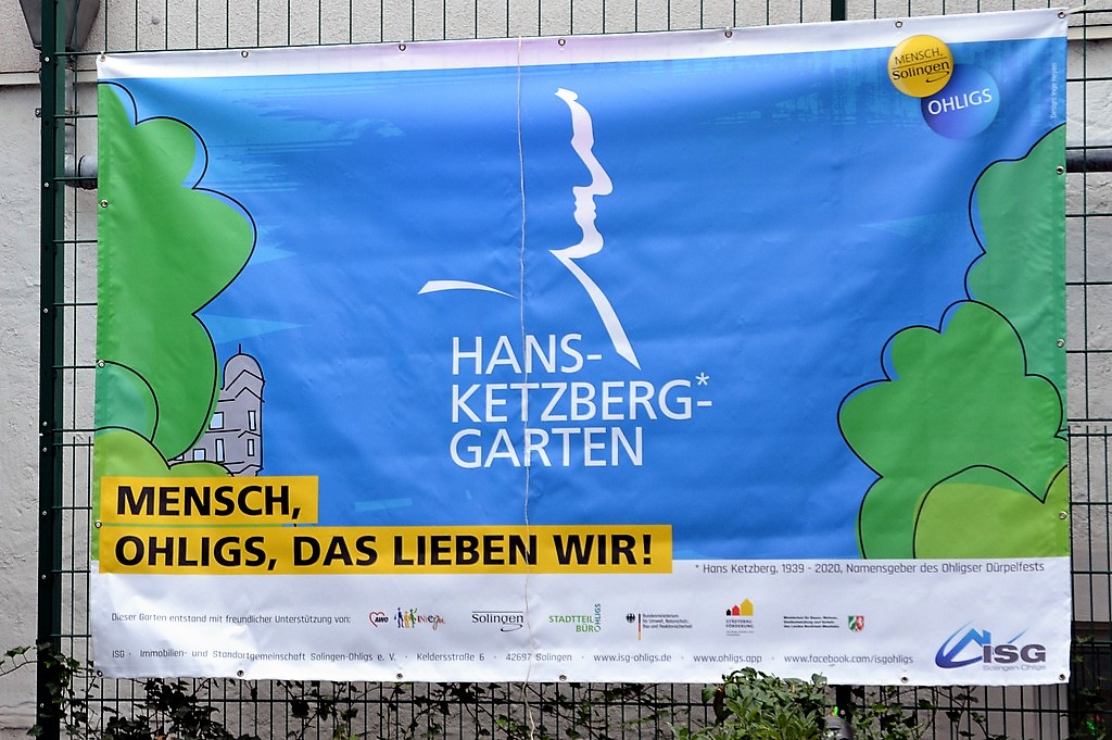 Und auf dem abgerollten Banner prangte in großen Buchstaben „Hans-Ketzberg-Garten“. Der in diesem Jahr verstorbene Hans Ketzberg war Mitbegründer und Namensgeber des Dürpelfestes und langjähriger Vorsitzender der Ohligser Werbe- und Interessengemeinschaft (OWG). Freude und Stolz auch bei der Familie Ketzberg, die es sich nicht hatte nehmen lassen, zur Eröffnung zu kommen, und nach der offiziellen Eröffnung unter tatkräftiger Hilfe von Ingrid Diermann gemeinsam einen Blaubeerbaum pflanzte.