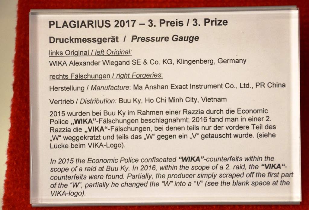 Es wird über China vertrieben. Dem Plagiator ist sein Design zwar gut gelungen, aber die technische Gestaltung weist massive Defizite auf. Auch der dritte Preis geht an einen Fälscher im asiatischen Raum. Das Druckmessgerät der Firma Wika wird über Vietnam vertrieben. 2015 waren bei einer Razzia Fälschungen beschlagnahmt worden. Ein Jahr später wurden diese Produkte erneut entdeckt, plump retuschiert bei dem Versuch, aus dem W ein V zu machen.