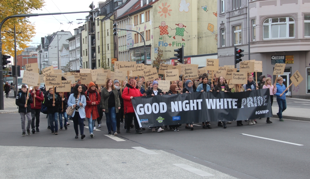 Rabbi David Vinitz sprach zum Abschluss des Gedenkens ein Gebet. In einem Demonstrationszug zogen nach der Gedenkveranstaltung auf Einladung des Jugendstadtrates zahlreiche Schülerinnen und Schüler von der Malteserstraße zum Theater und Konzerthaus. Dabei trugen sie Schilder mit Namen von Opfern der Nazis. Im Theater und Konzerthaus wurde das Gedenken der Reichspogromnacht mit weiteren Aktionen für Jugendliche zum Abschluss gebracht. Am späten Nachmittag wurden zudem an den verlegten Stolpersteinen in der ganzen Stadt im Rahmen der Aktion „Ein Licht für Stolpersteine“ Kerzen aufgestellt.