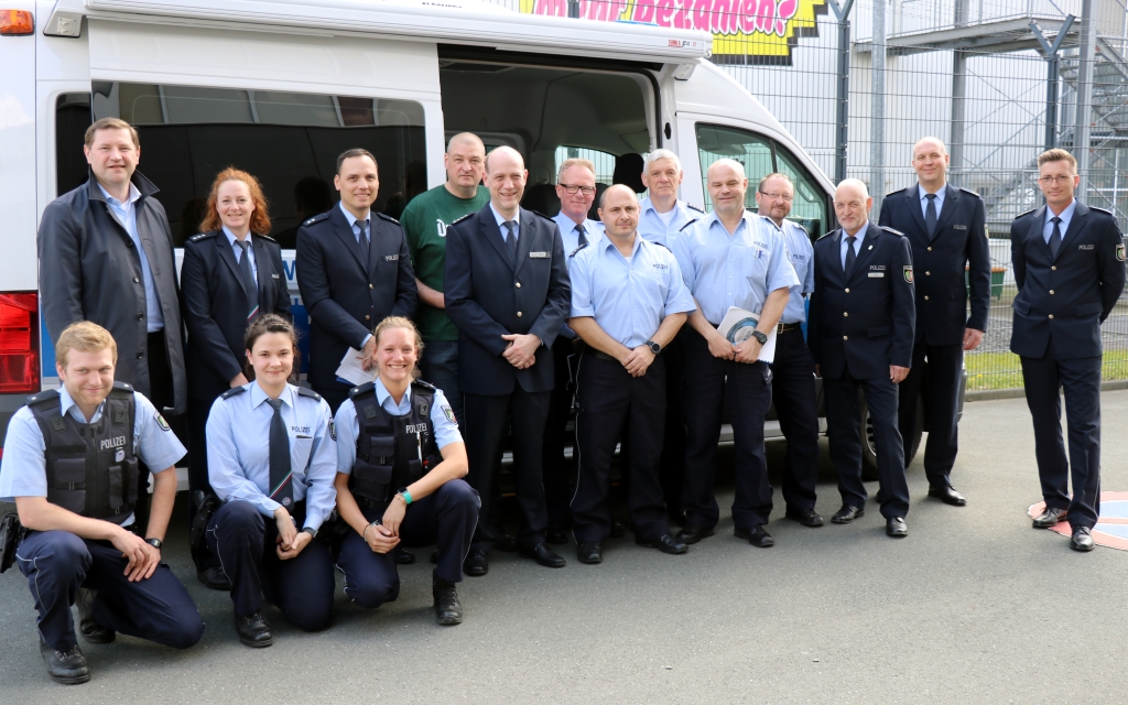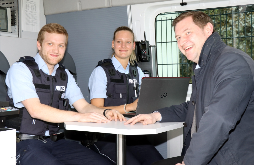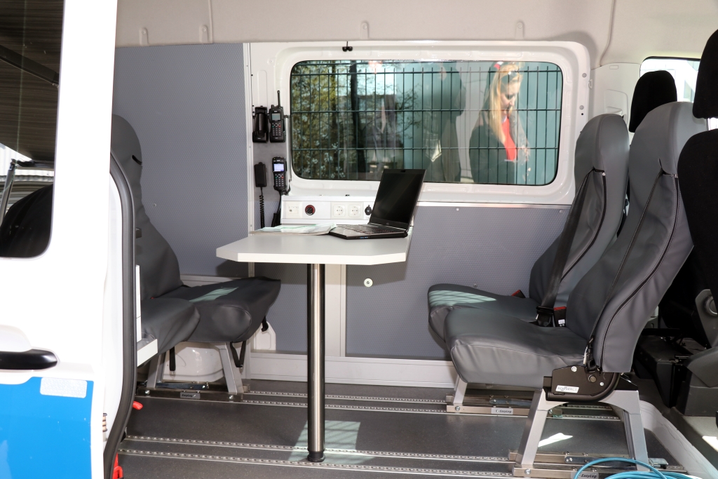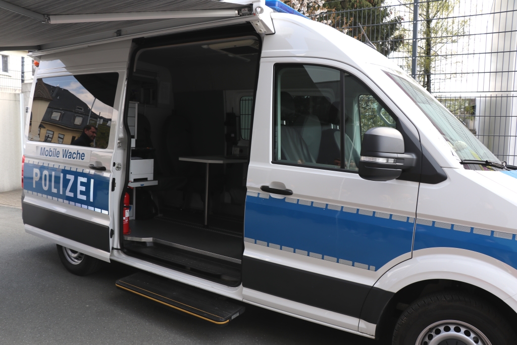 Insgesamt sechs Personen finden in dem VW Crafter Platz, der über vier Arbeitsplätze verfügt. Die Beamten können dort im Grunde all jene Formalitäten abarbeiten, wie sie es sonst in einer regulären Wache auch tun würden. Eine ausziehbare Markise sorgt außerhalb des Fahrzeugs für den Sonnenschutz. Am Montag ließ sich auch Oberbürgermeister Tim Kurzbach Details der „Mobilen Wache“ erläutern.