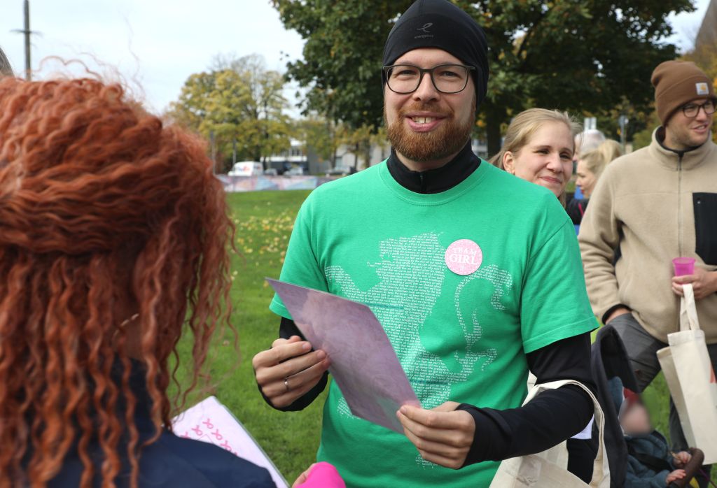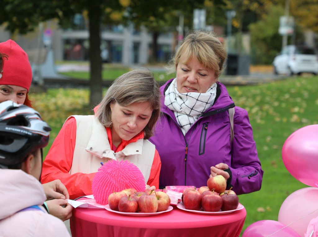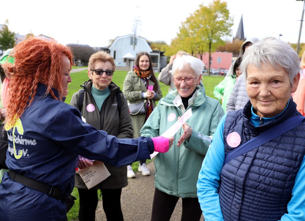 Einige Teilnehmer trugen – wie im Vorfeld gewünscht – rosa oder grüne T-Shirts als sichtbares Symbol der Solidarität und im Rahmen der Kampagne „Gemeinsam sind wir pink“, mit der die Helfenden Schirme auf das Thema Krebsprävention aufmerksam machen.