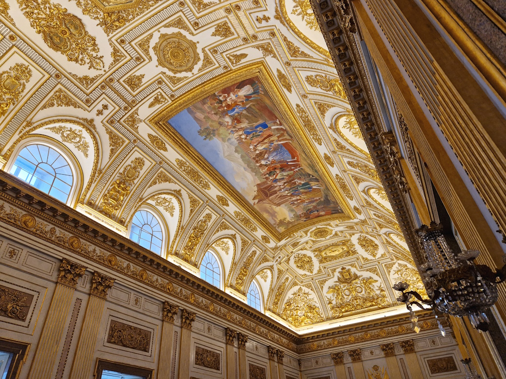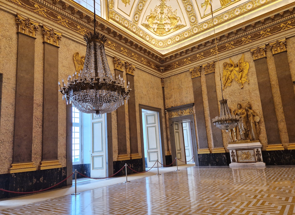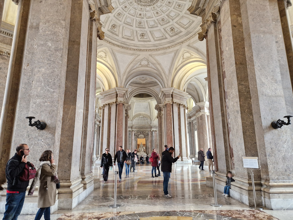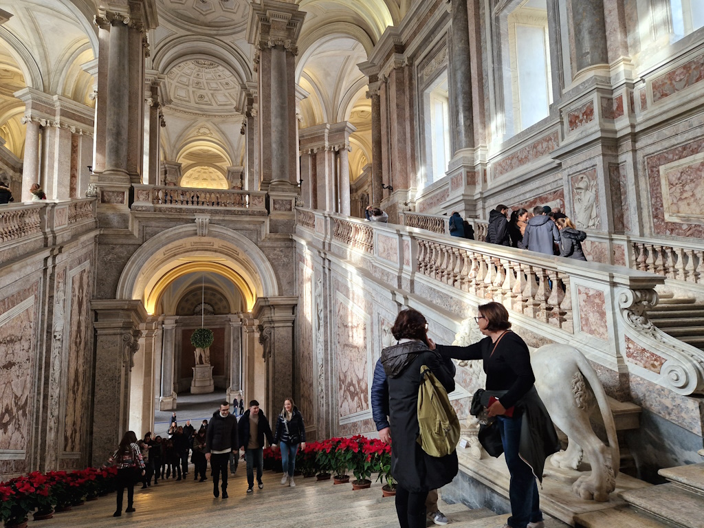 Grüner, weißer, roter und schwarzer Marmor glänzen in den eleganten Zimmern und Sälen des Königspalastes, wo Skulpturenensembles auf farbenfrohe Fresken hoher Decken treffen. Wann immer Sie das „italienische Versailles“ besuchen, bedenken Sie, dass stets viele Besucher vor Ort sind. Ein Audioguide ist eine Option, aber auch ohne gibt es vieles zu entdecken. Die erste und vielleicht wichtigste Sehenswürdigkeit des Palastes ist die Treppe aus weißem Carrara-Marmor – die Vanvitelli-Treppe. Diese mehrstufige Innentreppe symbolisiert den Übergang von der Dunkelheit (dem Halbdunkel des Erdgeschosses) zum Licht, das durch die Fenster strömt. Die zentrale Rampe der Königlichen Treppe wird von zwei Löwenskulpturen flankiert, die die Stärke von Geist und Körper symbolisieren.