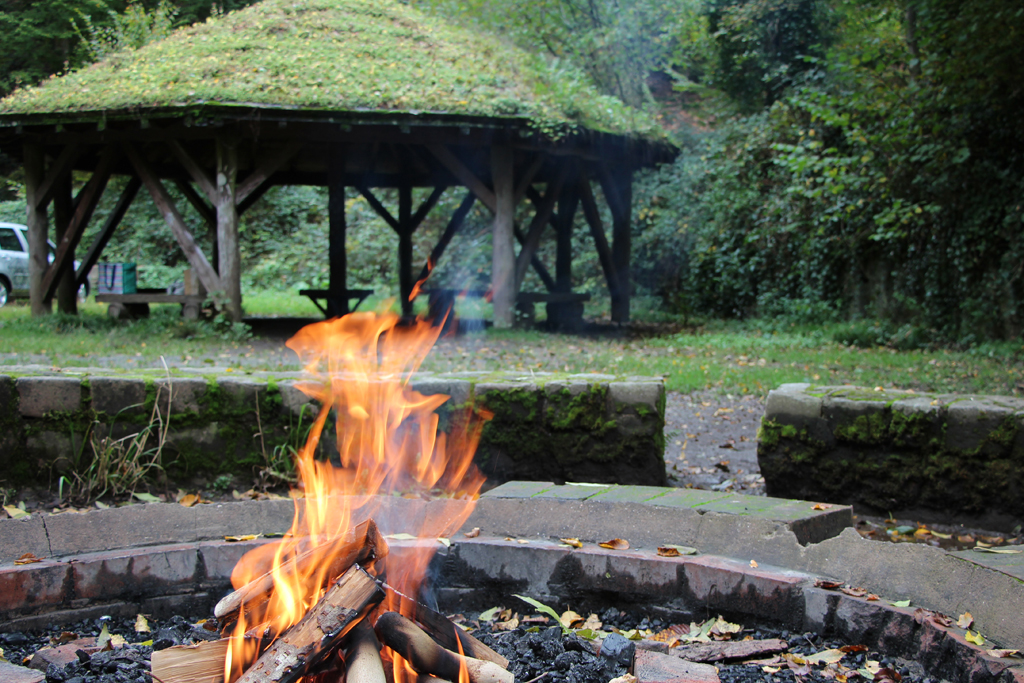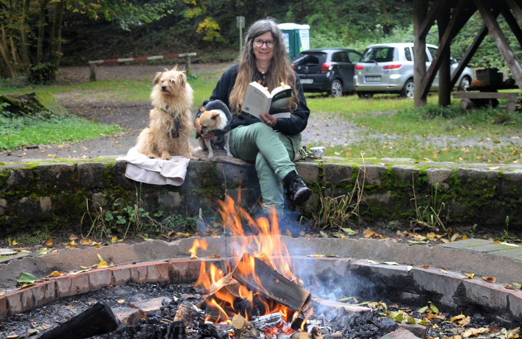 Am flackernden Feuer las die Autorin Saga Grünwald auf dem Grillplatz Altenhammer aus ihrem neuen Krimi "Spurlos im Bergischen Land". (Foto © Saga Grünwald)
