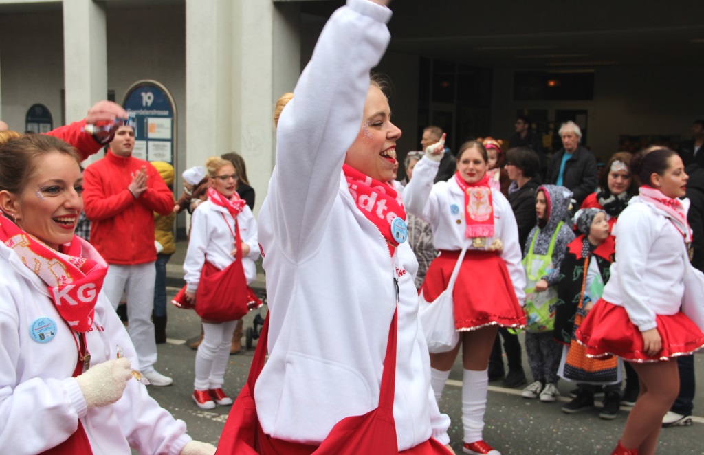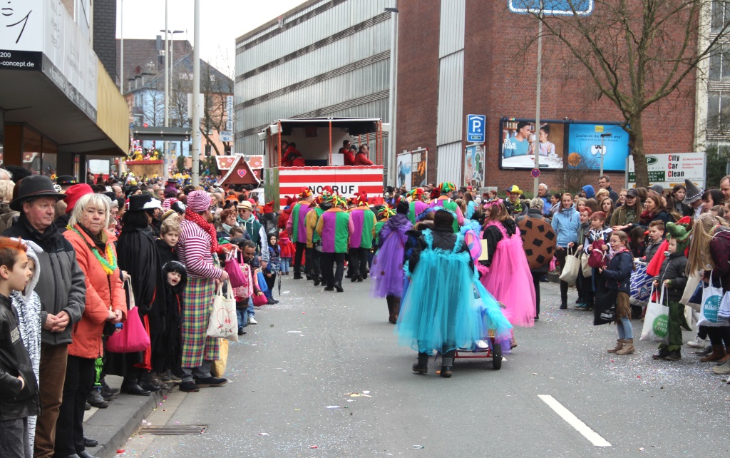 Vom Birkenweiher bewegte sich der Zug langsam die Goerdeler Straße hinauf. Nicht nur von den über 20 Wagen hagelte es hochwillkommene Kamelle auf die unzähligen Narren am Wegesrand, auch die Fußgruppen kamen mit Taschen voller Süßkrams und anderer karnevalistischer Mitbringsel. Übrigens: Das diesjährige Sessionsmotto lautet ja „Wederkapriolen bliewen us gestohlen“. Im vergangenen Jahr musste der Zug bekanntermaßen sturmbedingt abgesagt werden. Auch für den Montag sagten die Wetterfrösche Regen voraus, der allerdings auf sich warten ließ. Sehr zur Freude der Zugteilnehmer und der Besucher. Später zeigte sich sogar die Sonne dem närrischen Volk in Solingens Innenstadt.