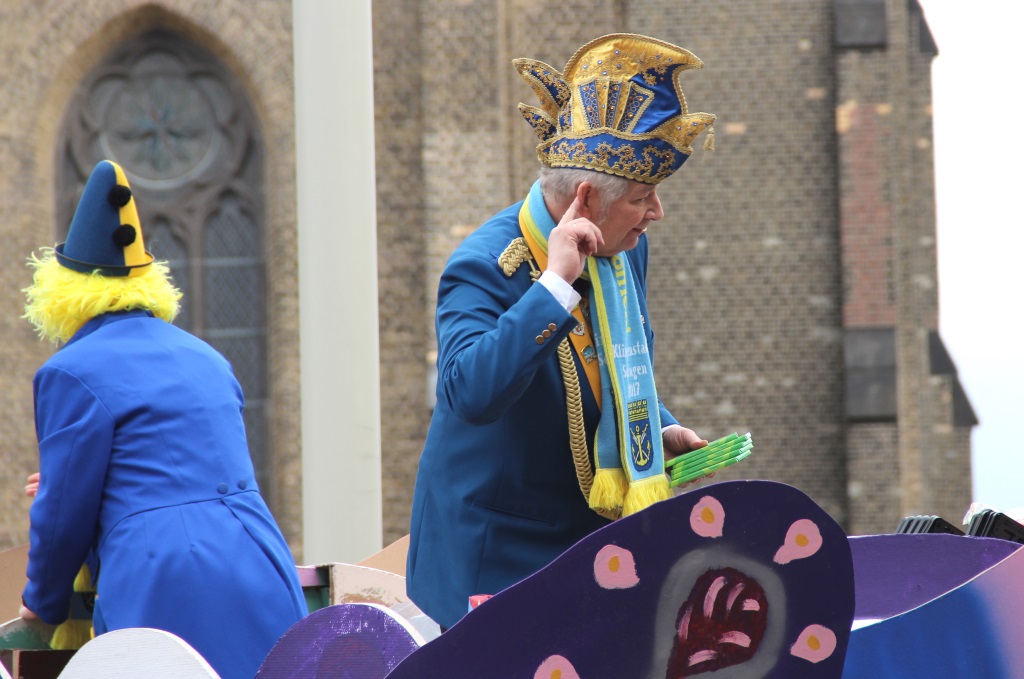 Mit von der Partie war auch ein Wagen der Stadtverwaltung rund um Oberbürgermeister Tim Kurzbach. Die städtischen Karnevalisten haben sich als „Haushalts-Panzerknacker“ verkleidet. Kunterbunt kostümiert waren auch die meisten der Besucher am Wegesrand. Viele Cowboys und auch ein paar Indianer, zahlreiche Raubtiere, aber auch Vampire, Geister und selbst Ritter in kompletten Rüstungen wurden am Montagnachmittag gesichtet. Dazwischen unzählige Kinder, heiser vom „Kamelle“ rufen und die Taschen voller Süßigkeiten. Diese brachten unter anderem auch das Prinzenpaar Dani I. und Jochen I. von ihrem Wagen aus unters Volk. Selbstverständlich ließ sich auch Joachim Junker, Präsident der Ohligser Prinzengarde und Chef des Festausschusses Solinger Karneval (FSK), nicht lange bitte und warf fleißig Kamelle in Richtung der nimmersatten Jecken.