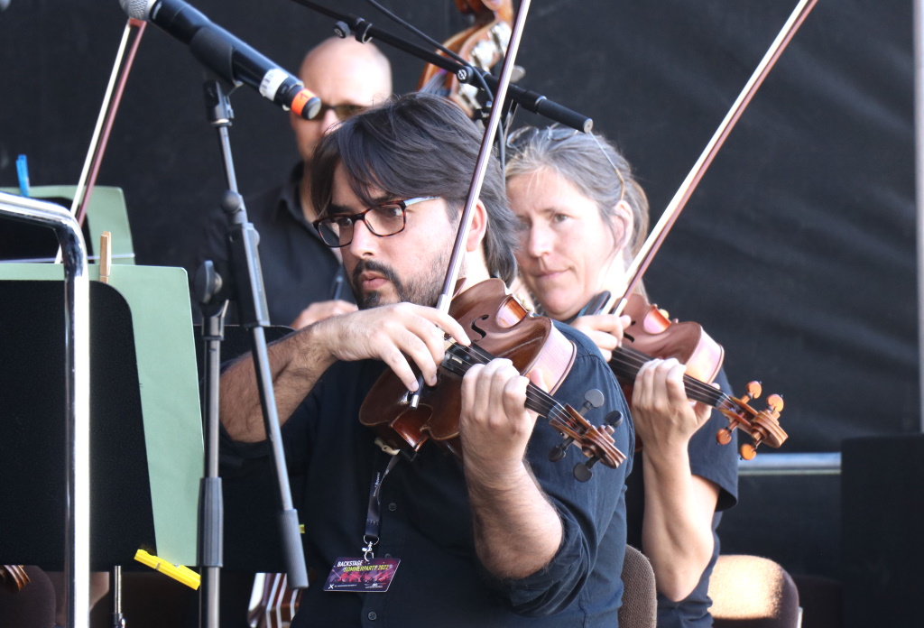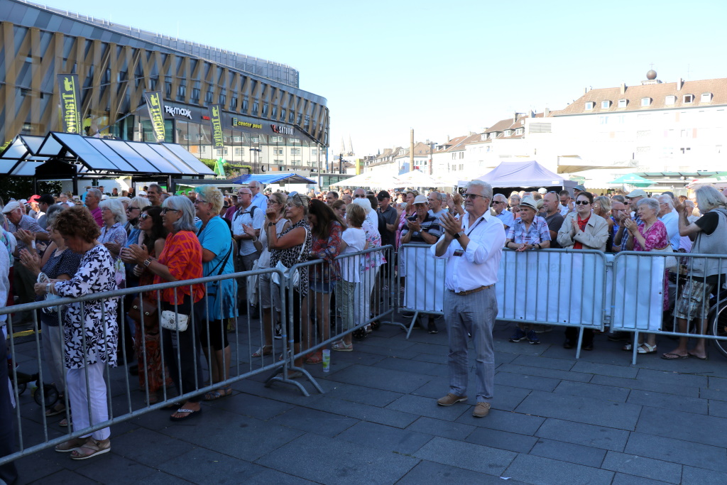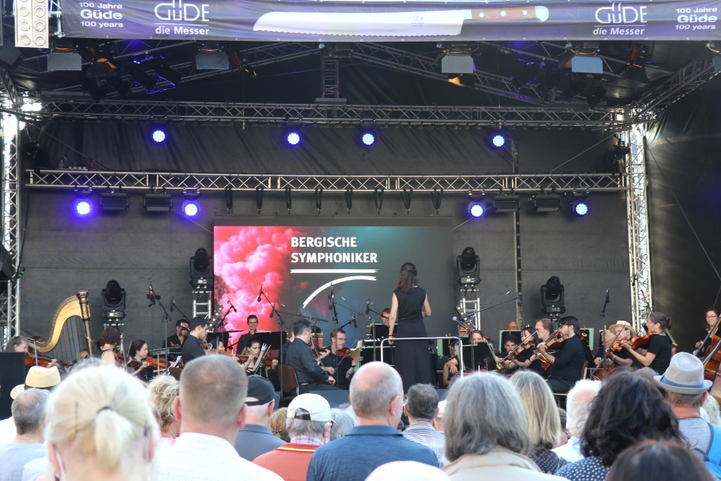 Spätestens mit dem Auftritt der Bergischen Symphoniker – fast 50 Musikerinnen und Musiker waren auf der Bühne – füllte sich nach und nach der Neumarkt. Sorgen, dass die klassische Komponente vielleicht nicht den Geschmack des Publikums treffen könnte, lösten sich recht schnell in Wohlgefallen auf. Denn so fiel letztlich die Reaktion der stetig wachsenden Zuschauer- und Zuhörerschaft vor der Bühne aus: Gefällig!