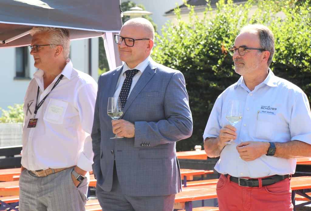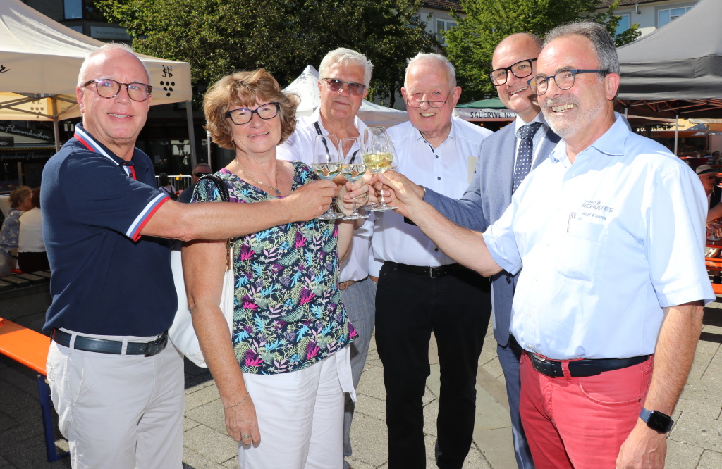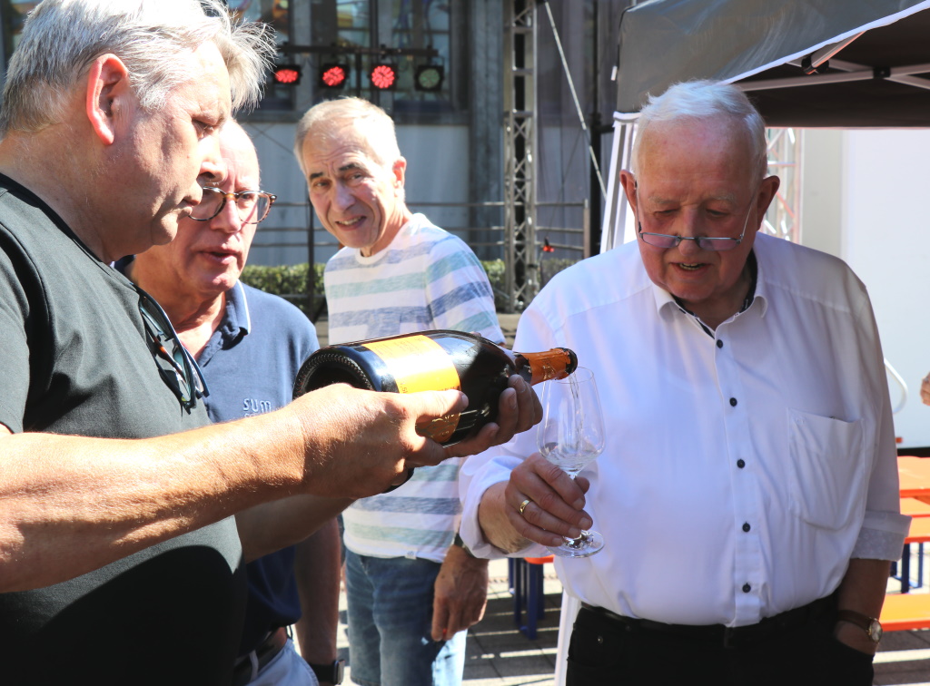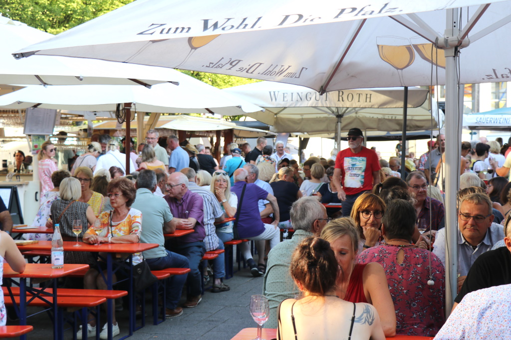SOLINGEN (bgl) – Es hat inzwischen gute Tradition, dass das Winzerfest eine Stunde vor der Sommerparty eröffnet wird. So war es dann nach dreijähriger Corona-Zwangspause am Freitagnachmittag auf dem Fronhof endlich wieder soweit: Pünktlich um 16 Uhr wurde bei hochsommerlichen Temperaturen angestoßen, neun Winzer kredenzen erlesene Tröpfchen aus den Anbaugebieten Rheinhessen, Mosel, Nahe und Pfalz.
