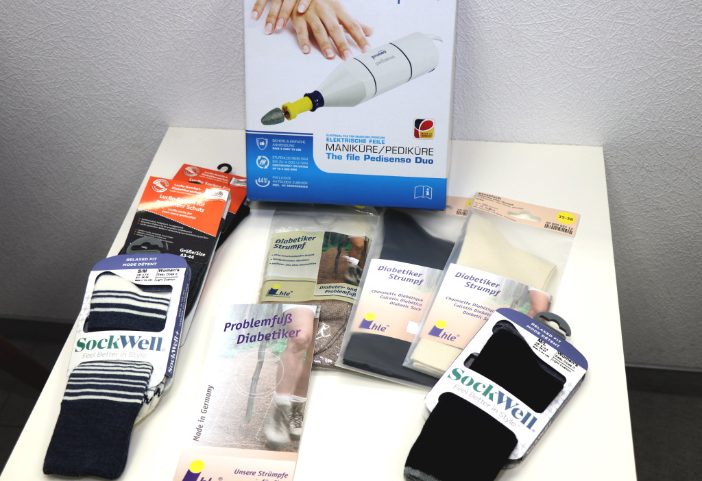 Ein wichtiges Thema beim “Diabetischen Fuß“ ist auch die Fußpflege. In Corona-Zeiten nicht ganz einfach, denn Podologen haben nicht immer geöffnet oder sind vollkommen ausgelastet. Im Sanitätshaus Köppchen gibt es ein eigens für Diabetiker entwickeltes Maniküre- und Pediküre-Set. Bei diesem besonderen Fußpflegegerät sind die Fräse-Aufsätze ganz besonders abgerundet, damit man sich selbst nicht verletzen kann. Auch hier berät speziell geschultes Fachpersonal zielgerichtet.