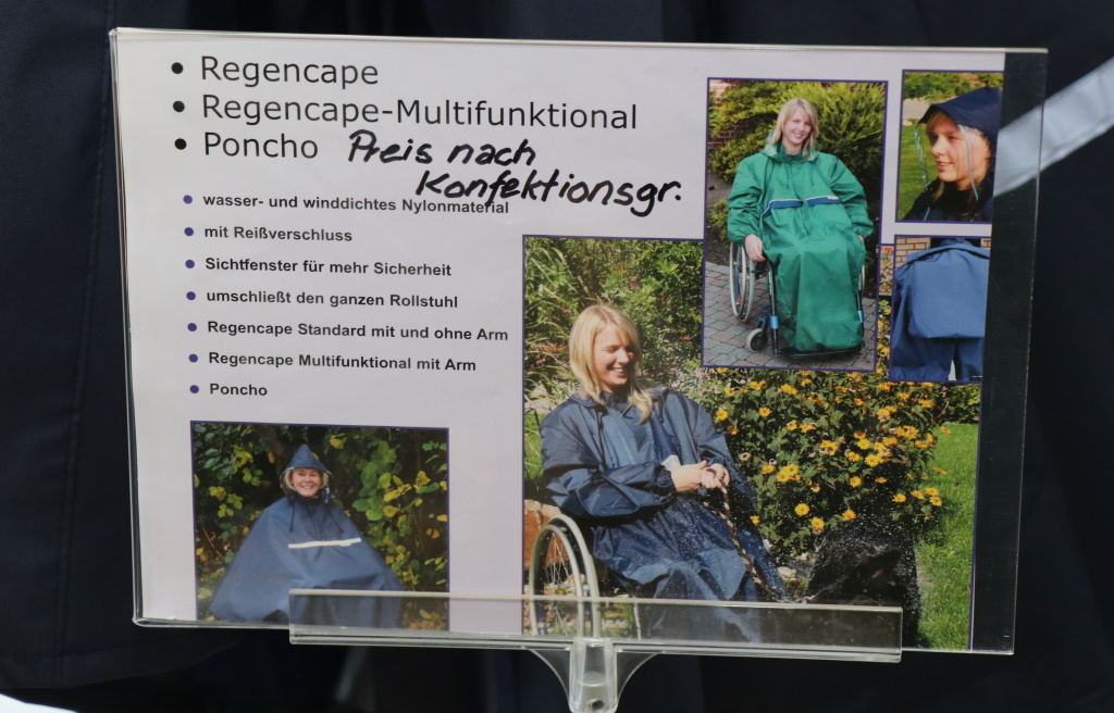 Derartige Regenschutz eignet sich natürlich ebenfalls für Personen, die mit dem Rollator oder einer anderen Gehstütze unterwegs sind. „Diese Regencapes gibt es in unterschiedlichen Schnitten für unterschiedliche Bedürfnisse. Beispielsweise auch für Menschen, die auf einen Rollstuhl angewiesen oder mit einem Scooter unterwegs sind“, zeigt Miriam Gatawetzki-Köppchen auf. Die Capes haben in der Regel Überlängen, so dass der Träger so gut wie möglich geschützt ist. Für Rollstuhl oder Scooter gibt es außerdem ganz spezielle Schutzsäcke, die dafür sorgen, dass man auch an den Beinen warm bleibt.