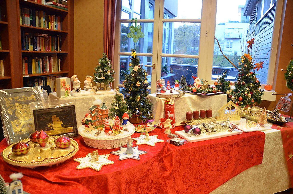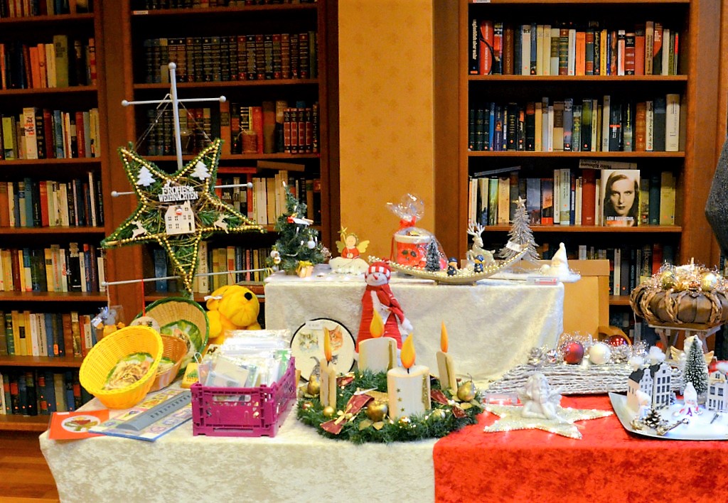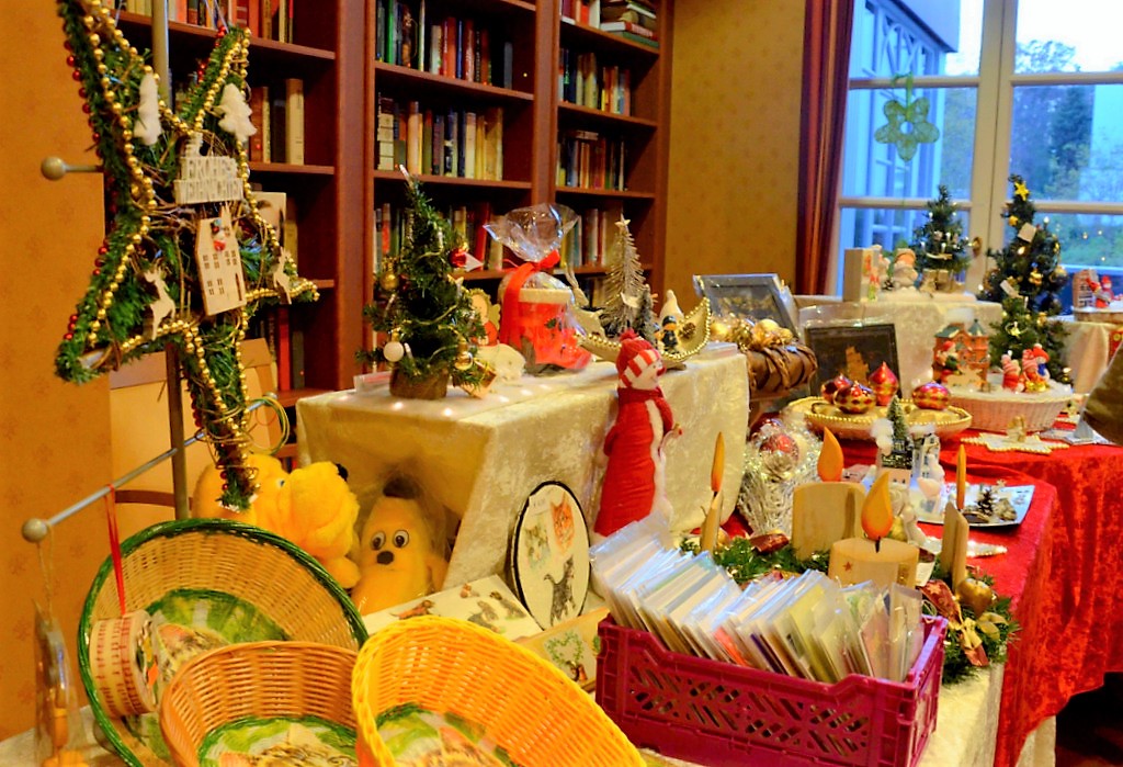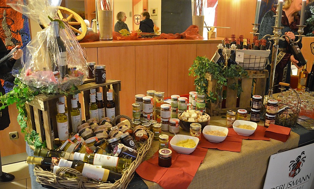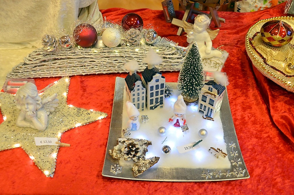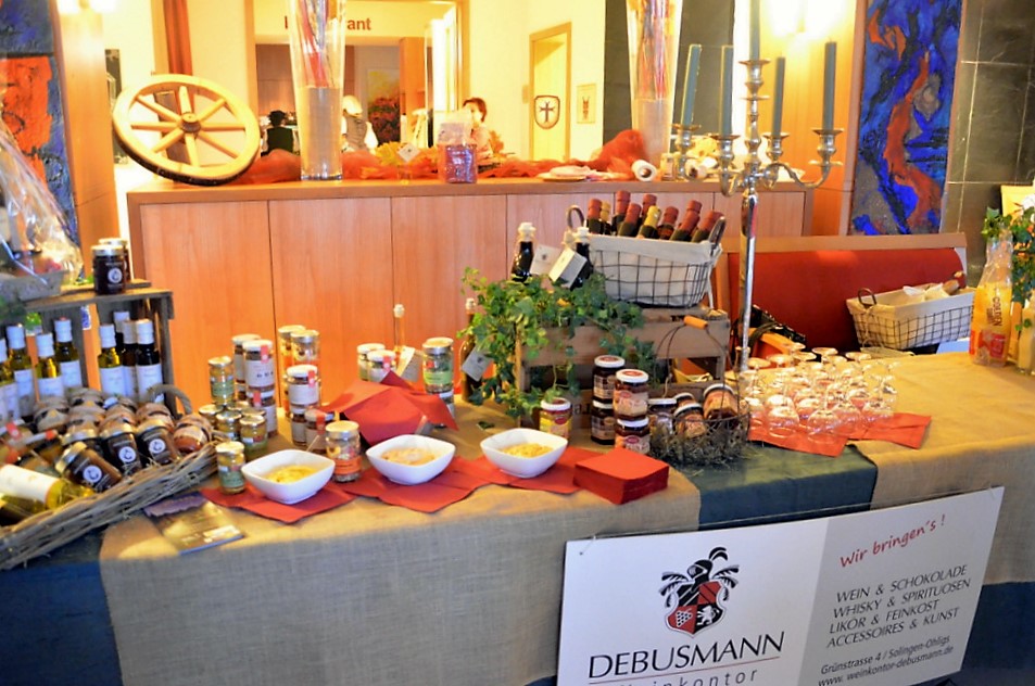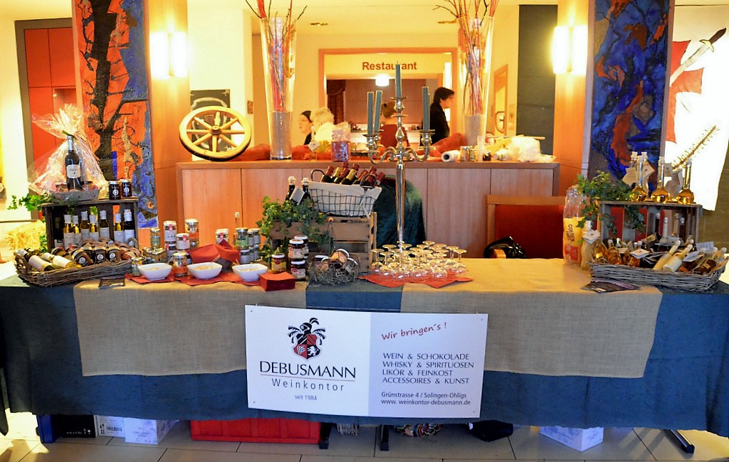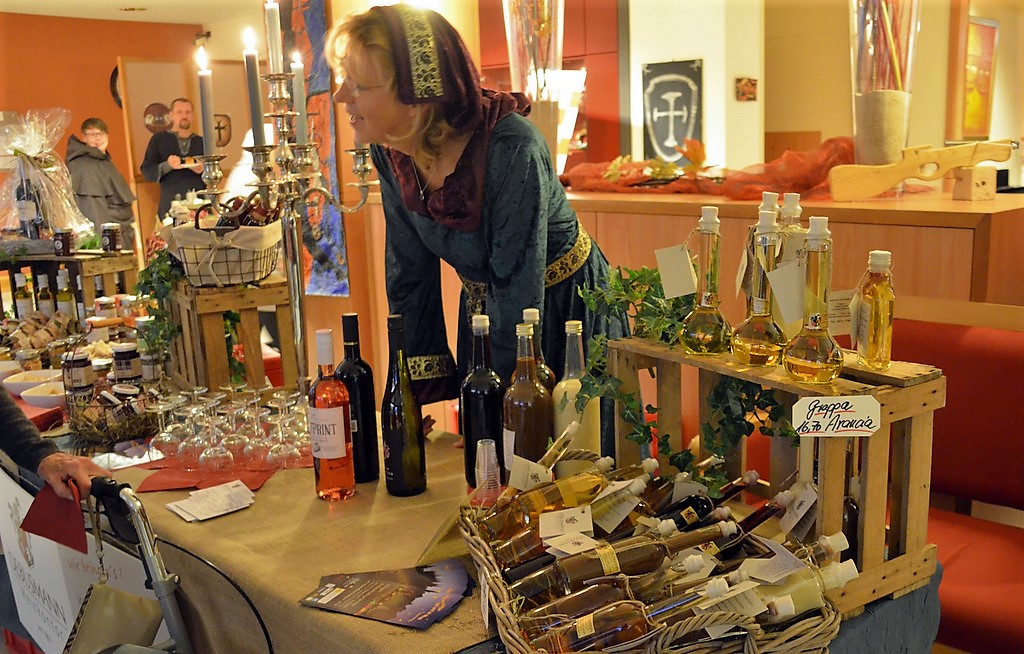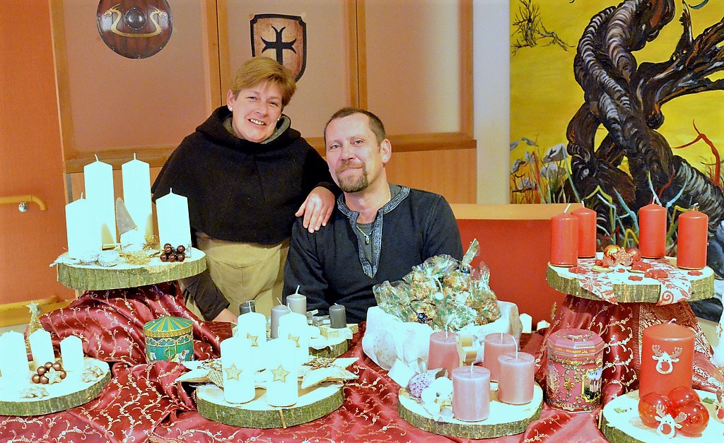 Stände im Innenbereich zeigten vielfältige Sortimente. Es gab köstliche Liköre, Schokolade und Feinkost sowie edle Kerzen und zauberhafte weihnachtliche Accessoires oder auch Geschenkartikel. Die mittelalterliche Innendekoration mit Schwertern, Strohballen und Hölzern schaffte eine typische Atmosphäre.