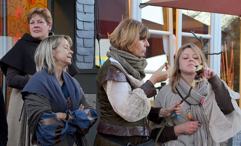 Ritter und Burgfräulein wandelten in traditionellen Gewändern an Marktständen aus längst vergangenen Zeiten vorbei. In einem großen Kessel dampfte ein deftiger Gulasch und am Feuerkorb war das Stockbrotbacken in vollem Gang. Heißer Würzwein fand regen Absatz.