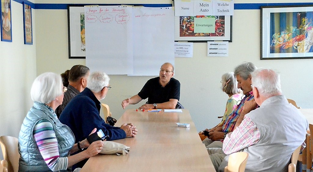 Vor Beginn der Praxis wurden in der kleinen Lerngruppe noch ein paar andere Sachen besprochen. Die Übungen sollten auf die Bedürfnisse der Senioren abgestimmt werden. So verriet beispielsweise eine Teilnehmerin, dass sie so weit wie möglich versuche, das Rückwärtsfahren zu umgehen. Andere schilderten selbst erlebte kritische Situationen und brachten ihre Erfahrungen in die Diskussion ein.