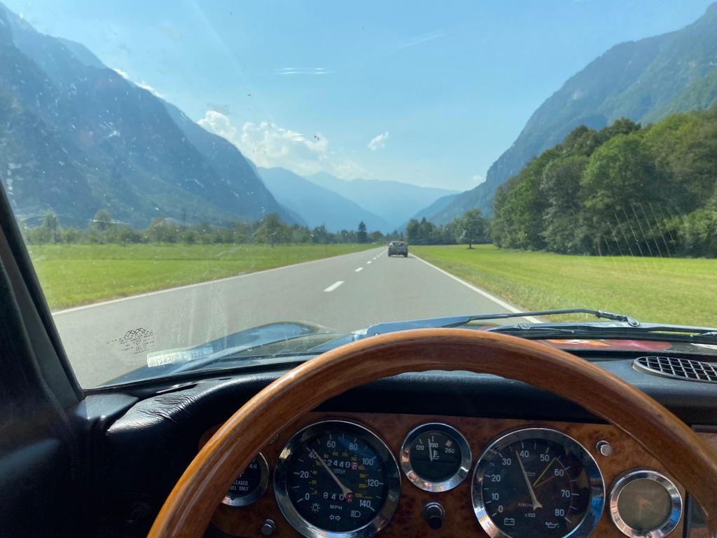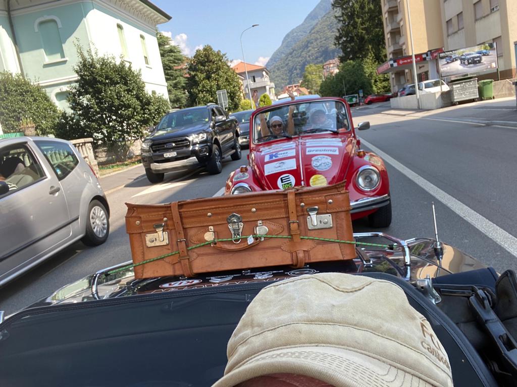 In diesem Zustand sind wir mit unserem Fiat Spider wir über den San-Bernadino-Pass gefahren und gut in Italien angekommen. Atemberaubendes Wetter, wunderschöne Aussichten und fast alle Teams haben die Zeit wirklich genossen. Allerdings hatte das Team Armbruster auch eine Reifenpanne, dennoch sind alle gut bis zum großen Empfang am Nachmittag ganz in der Nähe der Ponte San Michele gekommen.