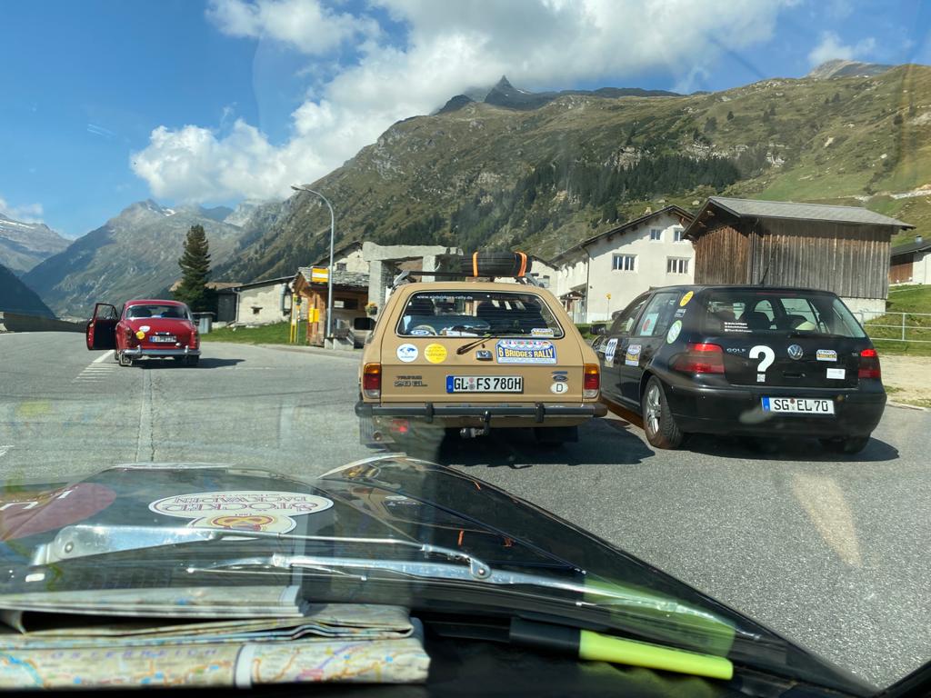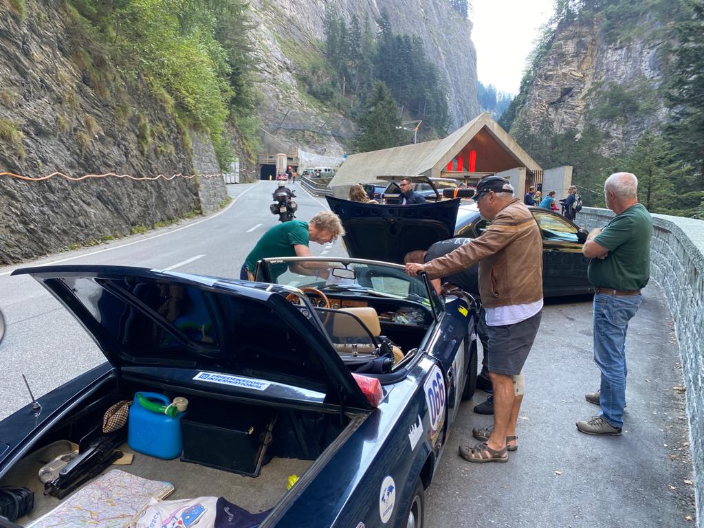 Was kann schöner sein, als eine Panne an der Viamala zu haben? Die Elektrik funktionierte nicht mehr, der Wagen ging aus und wollte nicht mehr anspringen. Es dauerte aber keine zehn Minuten, bis neun Leute aus den Teams bei uns waren und in den Motor schauten. Wir haben sogar eine Konferenzschaltung zu unserer Werkstatt nach Solingen organisiert. Der Wagen sprang dann zwar wieder an, aber das Licht blieb aus und die Fenster oben. Auch die Scheibenwischer funktionieren nicht.